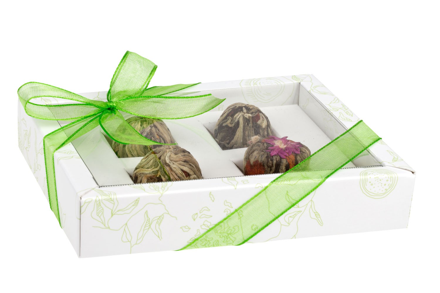 Objevte kouzlo čajového umění s kolekcí čtyř kvetoucích bílých čajů v elegantním zeleném balení. Po zalití se rozvinou do květů a nabídnou jemnou chuť s vůní jasmínu, lilie a laskavcovky – zážitek pro oči i chuť. Najdete v ní čaje Božská lilie, Posvátné květy, Rodinné štěstí a Vycházející slunce.