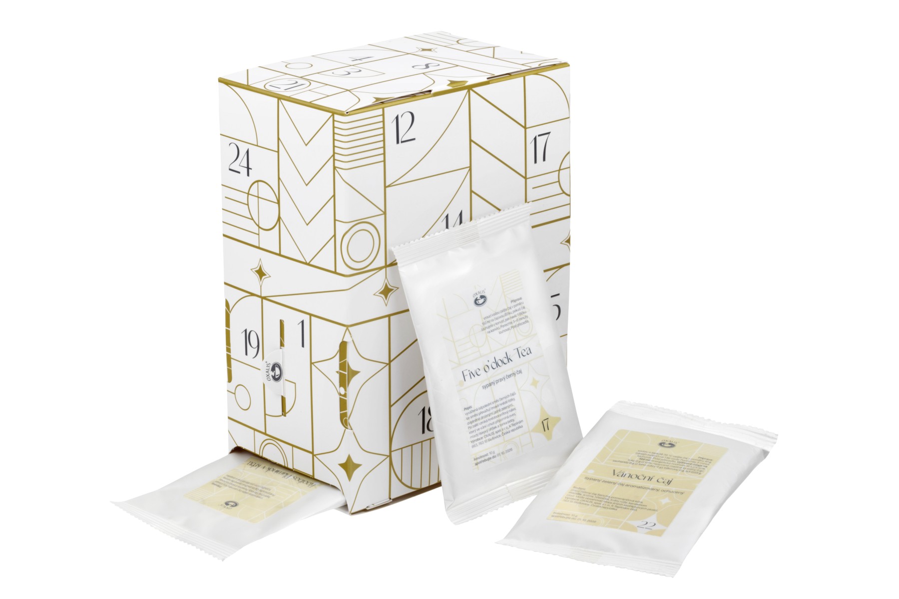 24x čaj o hmotnosti 10 g - určeno pro každý adventní den: Early morning tea - sypaný pravý černý čaj, Milky Jasmin Oolong - oolong aromatizovaný, Švestkový frgál - sypaný ovocný čaj bez ibišku, Rooibos Plamínek v krbu - sypaný bylinný čaj aromatizovaný, Malina-pepř - sypaný černý čaj aromatizovaný, Mátová pralinka - sypaný ovocný aromatizovaný čaj s ibiškem, Krupička - sypaný ovocný aromatizovaný čaj s ibiškem, Five o'clock Tea - sypaný pravý černý čaj, Darjeeling Gopaldhara FTGFOP1 Inbetween - sypaný pravý černý čaj, Green Snail "Zelený šnek" - sypaný pravý zelený čaj, Bancha Arashiyama - sypaný pravý zelený čaj, Rooibos Perníček - sypaný bylinný čaj aromatizovaný, Sváteční - sypaný černý čaj aromatizovaný, ochucený, Vánoční čaj - sypaný zelený čaj aromatizovaný, ochucený, Skořice - jablko - sypaný ovocný čaj aromatizovaný, Rolničky - sypaný ovocný čaj aromatizovaný, China Jasmin - sypaný pravý zelený čaj ochucený, Earl Grey - sypaný černý čaj aromatizovaný, Alpský punč - sypaný černý čaj aromatizovaný, ochucený, Malý Buddha - sypaný zelený čaj aromatizovaný, ochucený, Rooibos České Vánoce - sypaný bylinný čaj aromatizovaný, Ájurvédský čaj Pomeranč s kořením - sypaný bylinný čaj z koření aromatizovaný, Vánoční dobroty - sypaný ovocný čaj aromatizovaný, Zimní pohádka - sypaný ovocný čaj aromatizovaný. Kartonový obal.