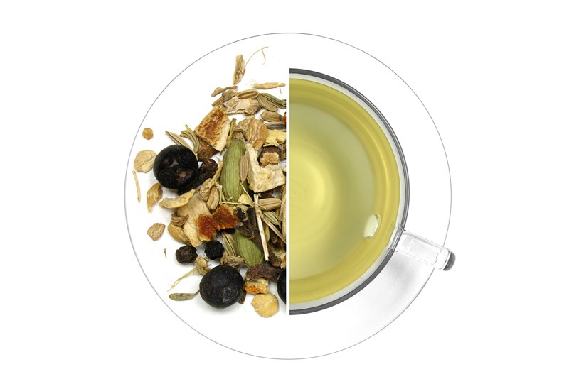 Zázvor, pomerančová kůra, hřebíček, skořice, kardamom plod, jalovec plod (jalovčinky), fenykl plod, lékořice kořen, smetánka kořen, černý pepř a andělika kořen.