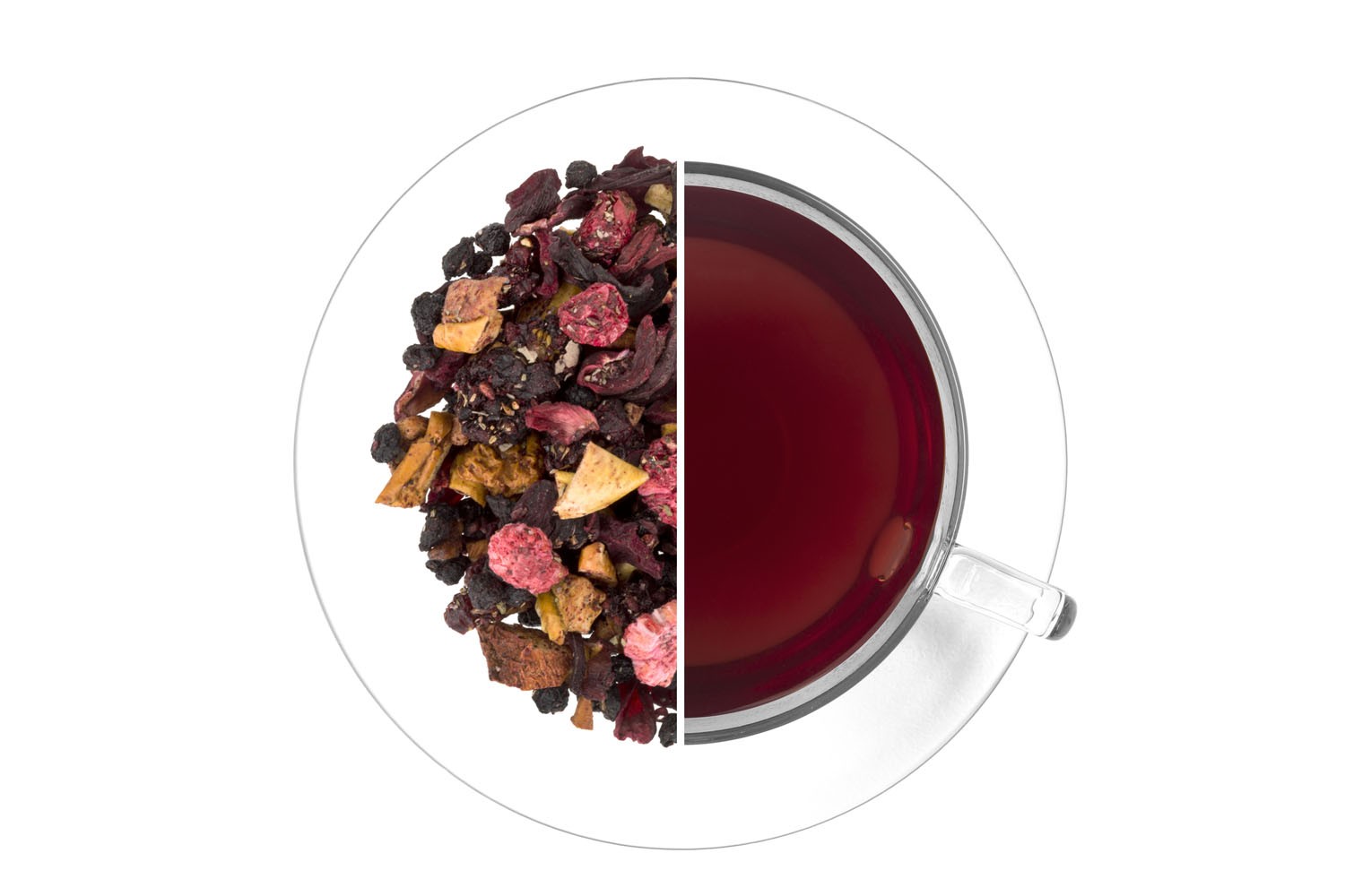 Černý bez plod, jablka, ibišek, arónie plod, červená řepa, ostružiny, aroma, červený rybíz, maliny, ostružiník list, jahody. Může obsahovat stopy skořápkových plodů.