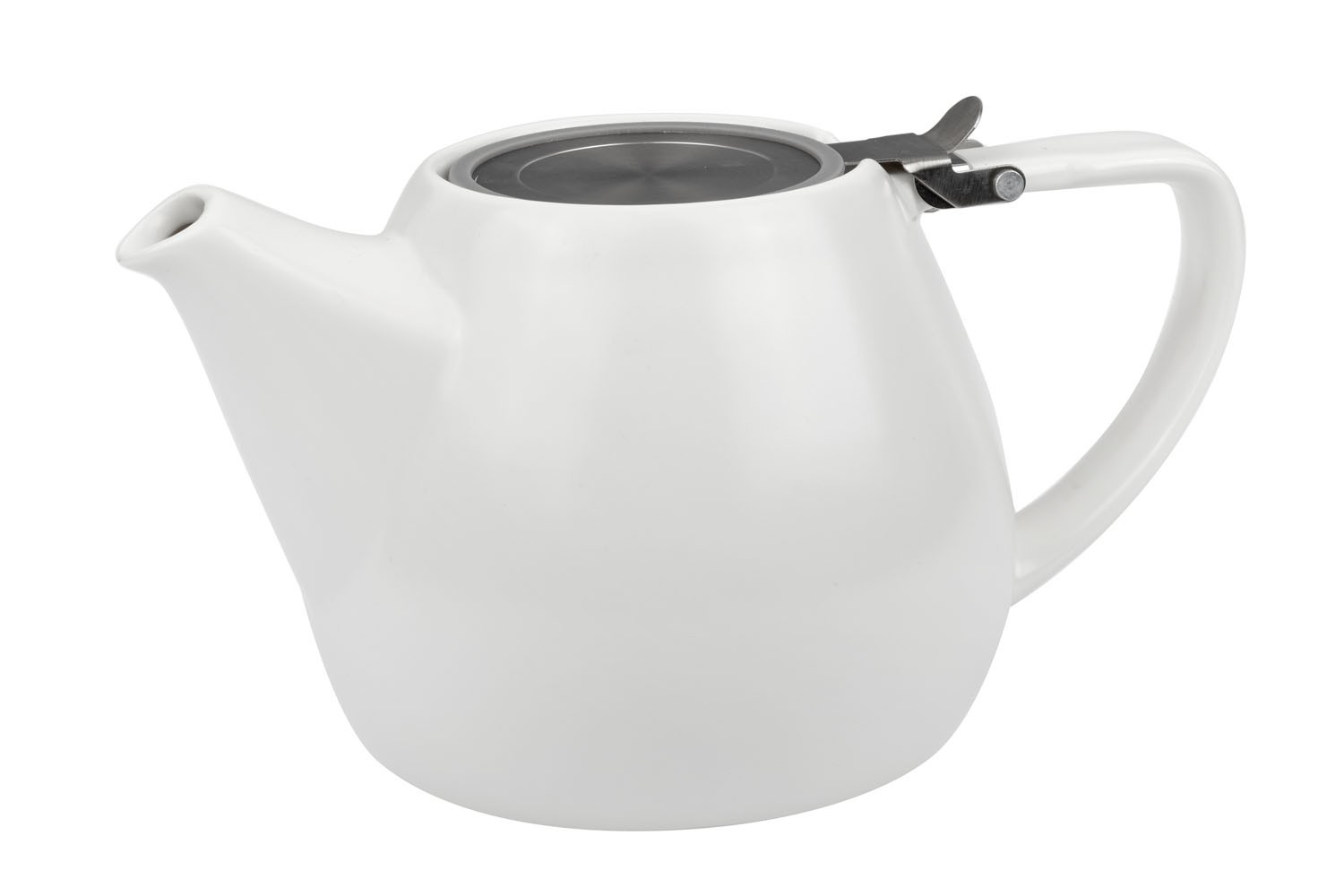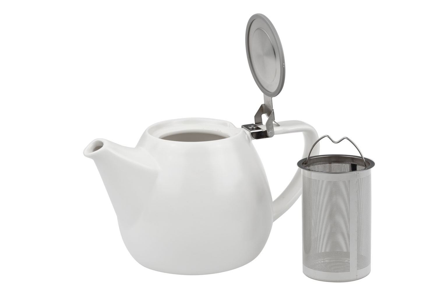 Porcelánová konvice s nerezovým sítkem a poklicí. Bílé matné provedení.Objem 1,1 l.