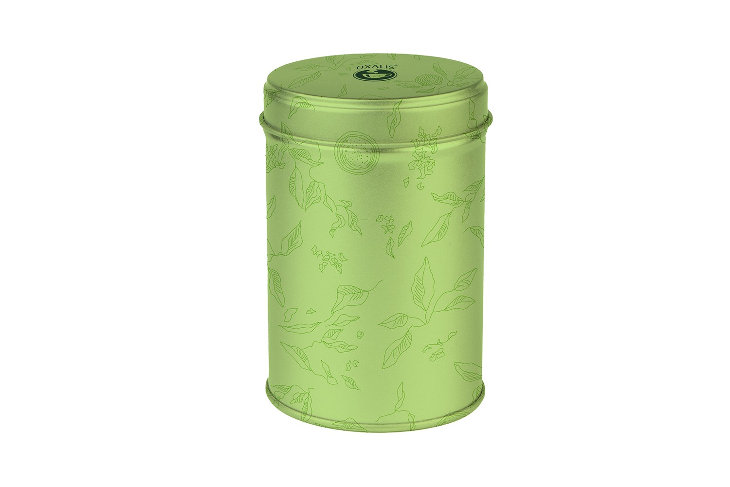 Plechová dóza na čaj s vnitřním víčkem, zelený design s jemnou linkou. Objem 50 g.