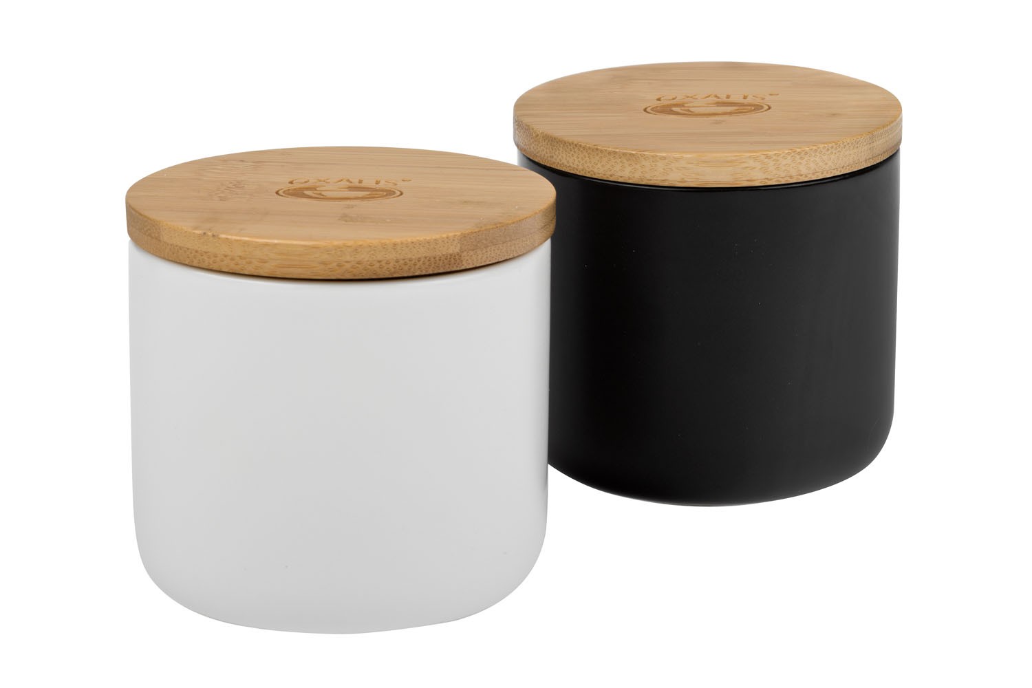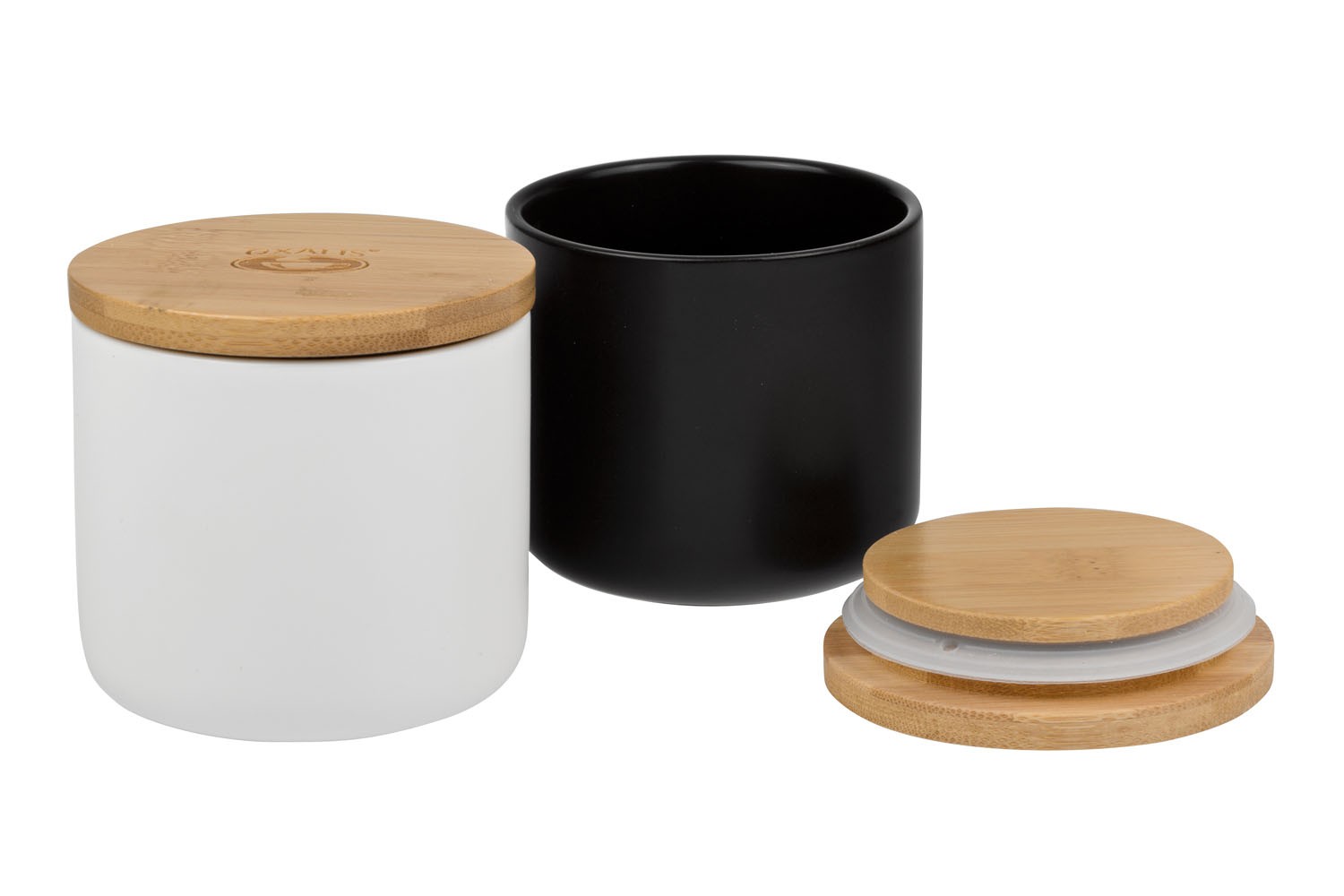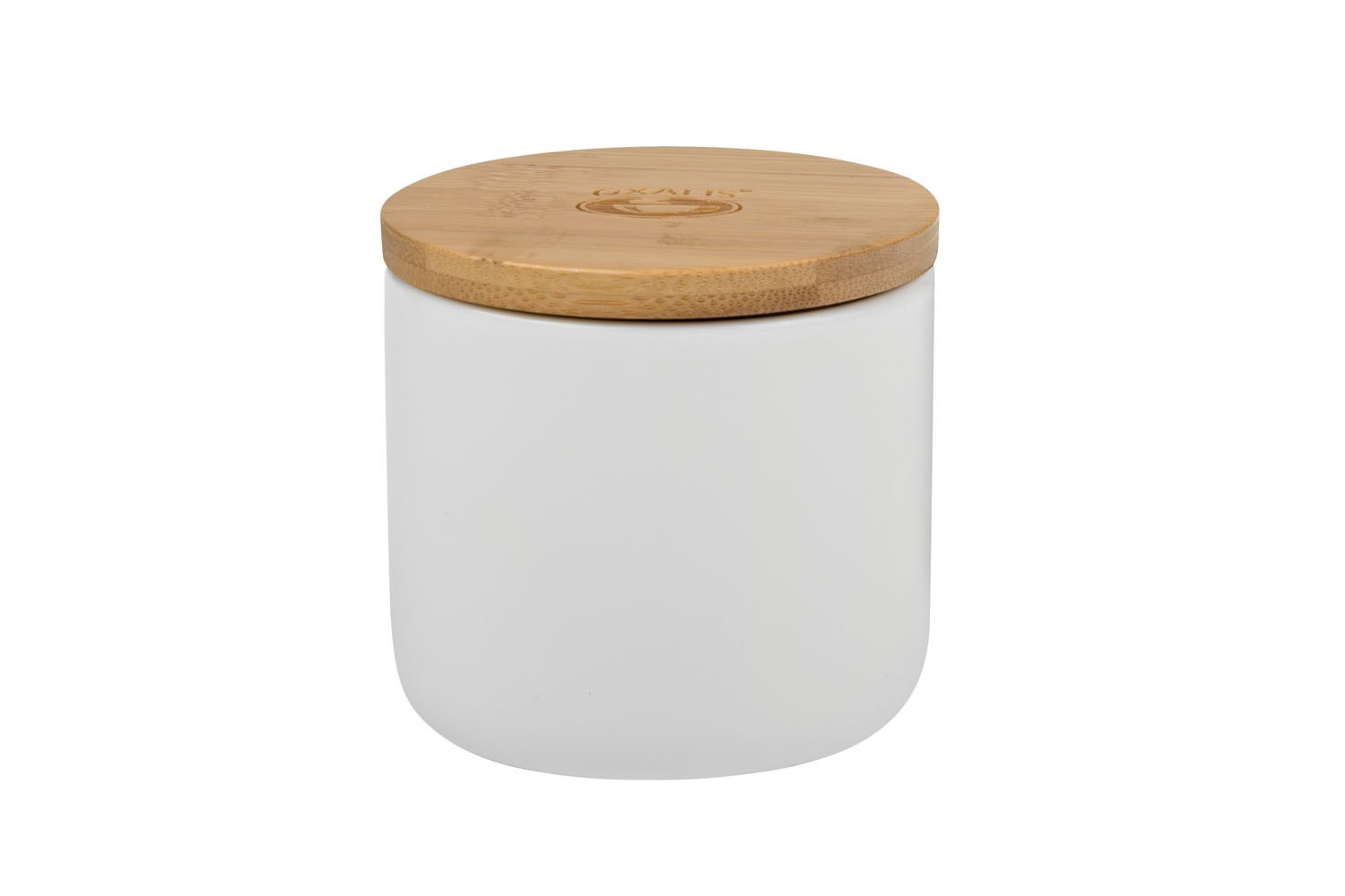 Porcelánová dóza s bambusovým víčkem se silikonovým těsněním pro uchování čaje nebo kávy. Bílé matné provedení.Objem 240 ml.