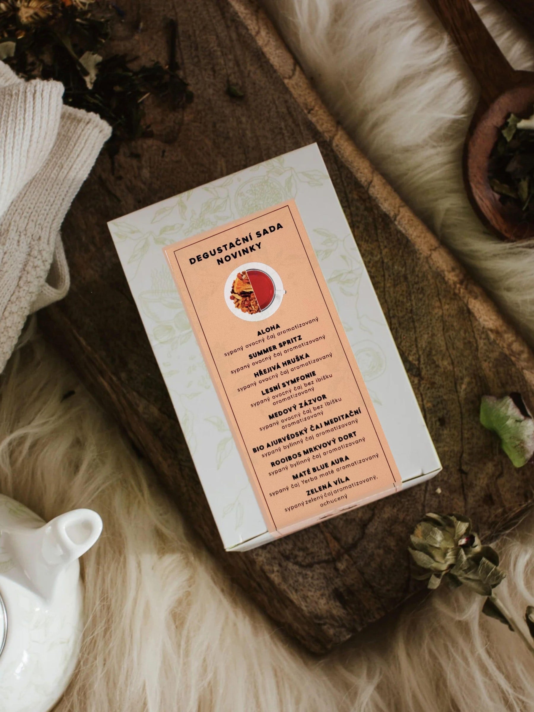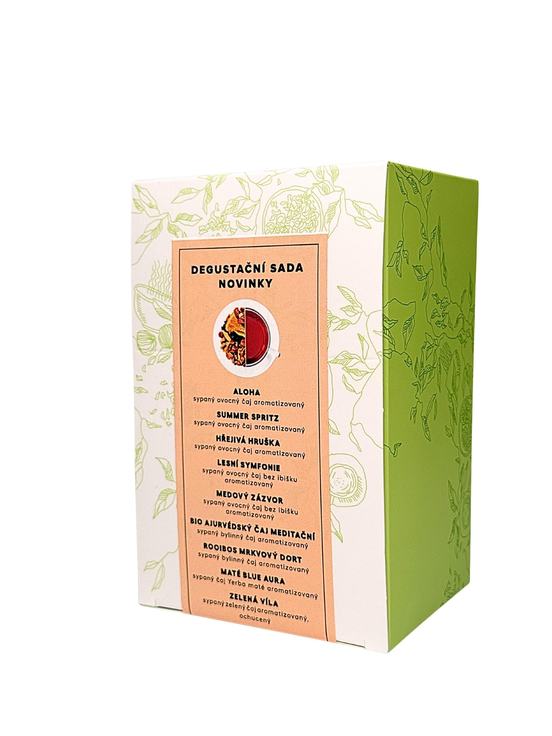 Objevte bohatství chutí a vůní v této exkluzivní degustační sadě. Výběr ovocných, bylinných, zelených a černých čajů vám umožní ochutnat ty nejnovější čajové novinky, které jsme vyvinuli. Ideální pro chvíle relaxace nebo inspirující degustaci. Stylové balení je perfektní jako dárek nebo malý čajový objevný zážitek.Složení: sypané ovocné čaje aromatizované Aloha 10 g, Summer Spritz 10 g, Hřejivá hruška 10 g, sypané ovocné čaje bez ibišku aromatizované Lesní symfonie 10 g, Medový zázvor 10 g, sypané bylinné čaje aromatizované BIO Ájurvédský čaj meditační 10 g, Rooibos Mrkvový dort 10 g, sypaný čaj Yerba maté aromatizovaný Maté Blue Aura, sypaný zelený čaj aromatizovaný, ochucený Zelená víla 10 g a kartonový obal.