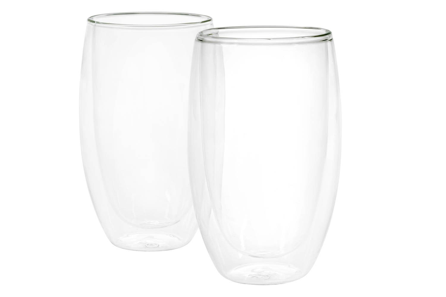 Sada 2 dvoustěnných šálků na latte (400 ml) z borosilikátového skla. Dvoustěnná konstrukce udrží nápoj déle teplý a zároveň je příjemná na dotek.