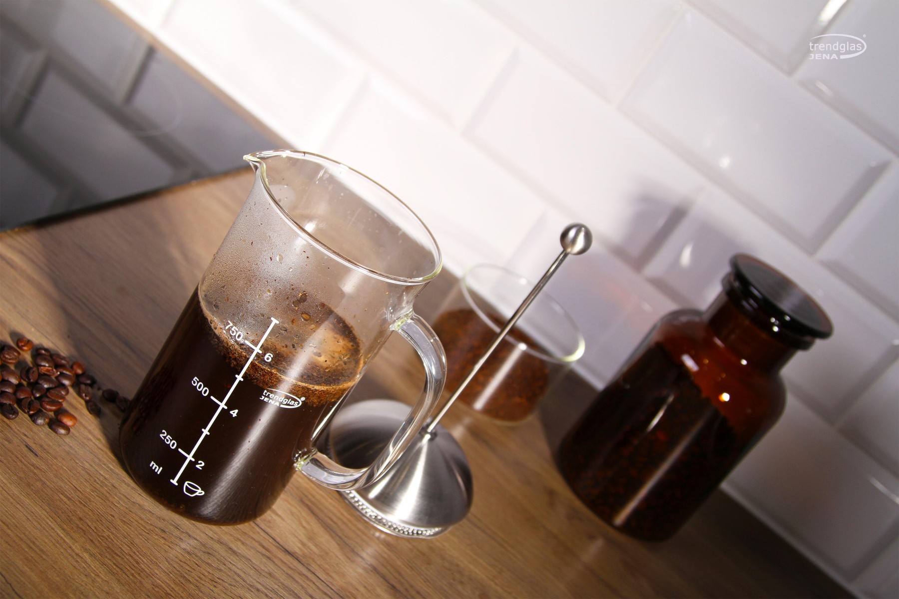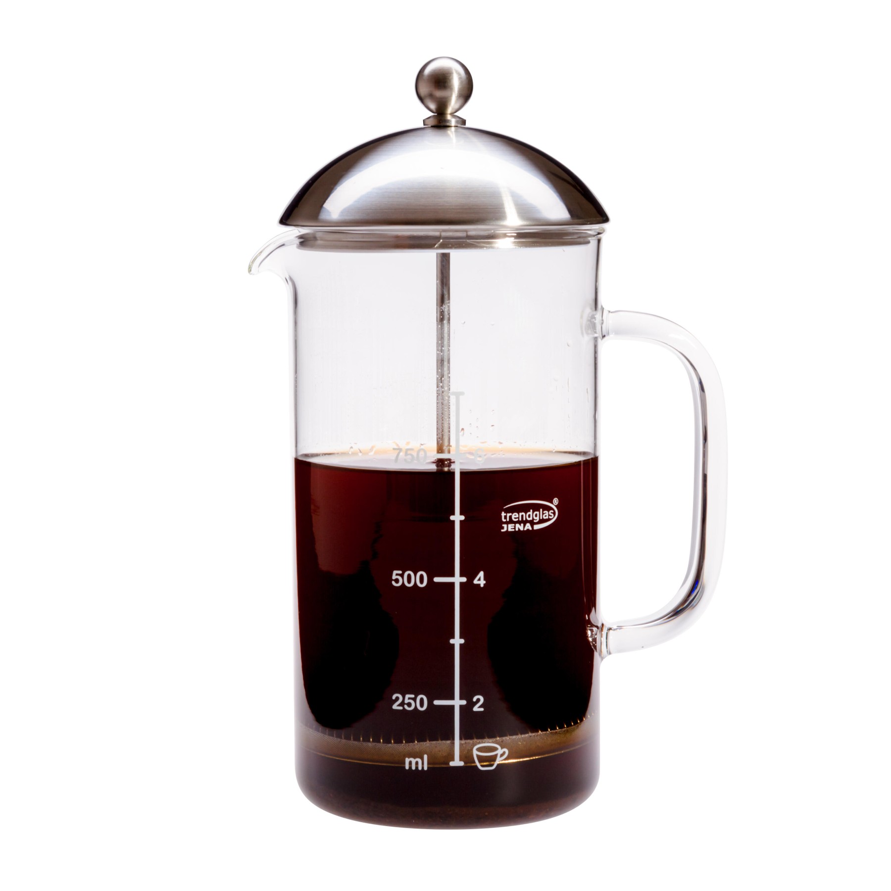 Elegantní French press od výrobce Trendglass je ideální volbou pro všechny milovníky kvalitní kávy. Díky kompaktnímu provedení a nadčasovému designu se stane stylovým doplňkem každé kuchyně i kanceláře. French press o objemu 1 litr je vyroben ze žáruvzdorného skla produkovaného v Německu, které odolává vysokým teplotám a umožňuje sledovat celý proces přípravy kávy. Kovový píst s jemným filtrem zajistí snadnou a efektivní extrakci, díky které vynikne plná chuť a aroma kávy. Praktická velikost je ideální pro přípravu až 3 šálků kávy, takže si můžete vychutnat svou oblíbenou kávu doma, v práci nebo při pomalých víkendových ránech.