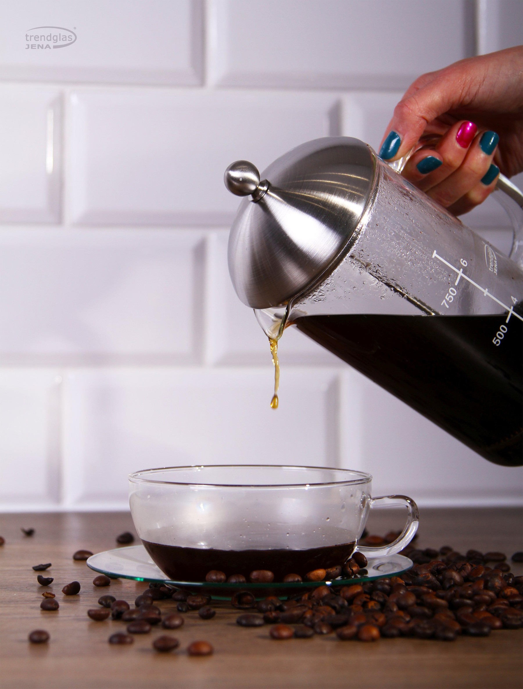 Příprava kávy ve french pressu je snadná a rychlá. Stačí nasypat hrubě namletou kávu (60–70 g na 1 l vody), zalít ji horkou vodou o teplotě 93–94 °C, po 30 vteřinách dolít zbytek a nechat 3,5 minuty louhovat. Nakonec pomalu stlačte sítko a ihned servírujte – získáte plnou chuť a aroma čerstvé kávy.