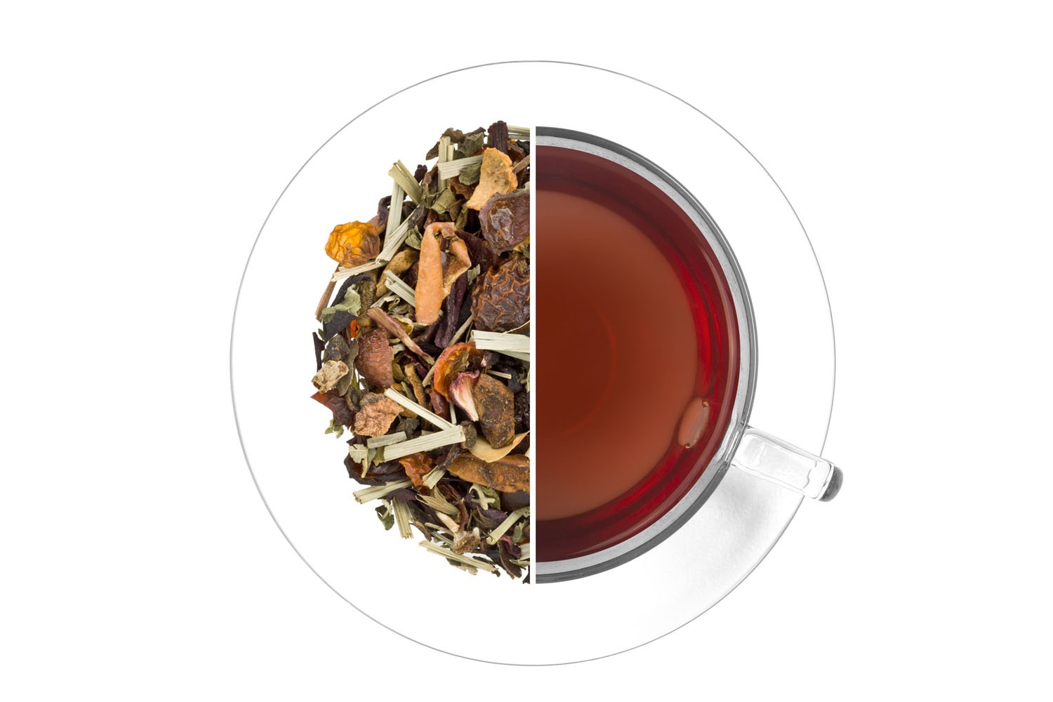 Růže šípková plod, kousky jablka, ibišek květ, guarana semeno (15 %), ostružina list, meduňka list, vonný citrónový list, aroma. Obsahuje kofein. Může obsahovat ořechy. Růže šípková - plod přispívá k přirozené obranyschopnosti organismu. Guarana přispívá k fyzické a psychické vitalitě. Dbajte na pestrou, vyváženou stravu a zdravý životní styl.