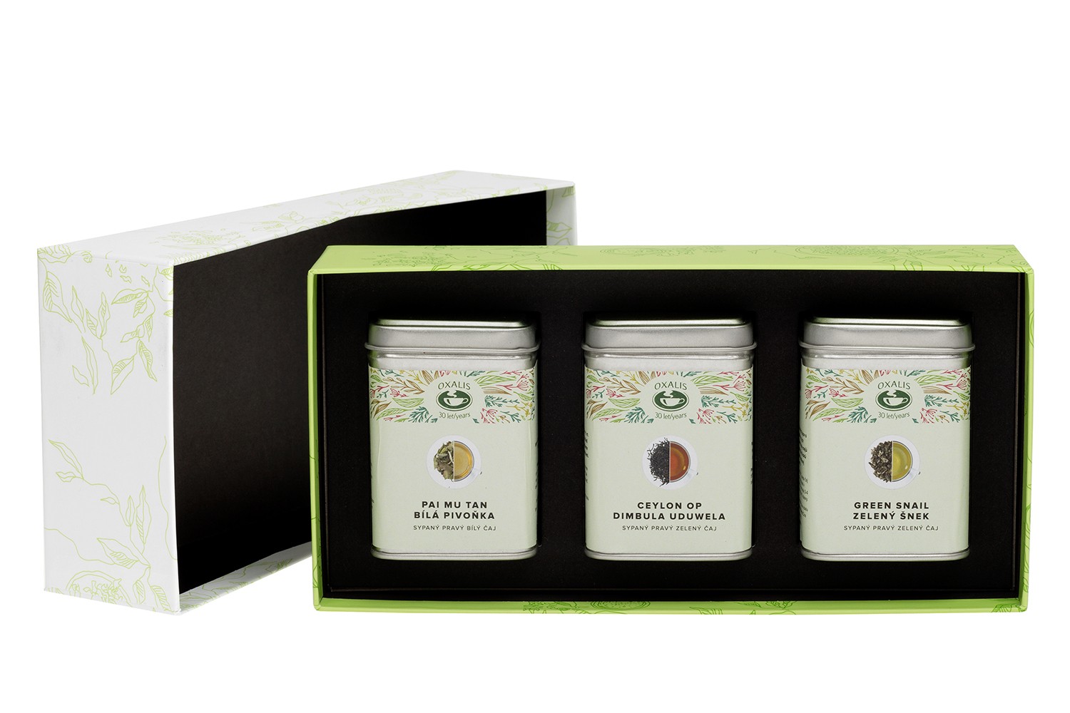Luxusní dárkové balení čajů potěší všechny, kdo ocení kvalitu a eleganci. Najdete v něm vybraný černý čaj Ceylon OP Nuwara Eliya (30 g), delikátní zelený čaj Green Snail „Zelený šnek“ (40 g) a jemný bílý čaj Pai Mu Tan „Bílá pivoňka“ (15 g). Všechny jsou uloženy v elegantních stříbrných plechových dózách a dárkovém kartonovém obalu, který z tohoto setu činí ideální dárek pro milovníky čaje.