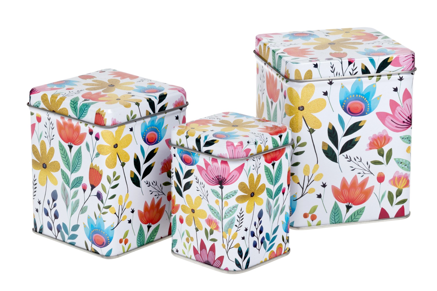 Praktická sada tří plechovek v jednotném designu s barevnými květy. Obsahuje malé, střední a velké provedení, takže se hodí na různé druhy čajů nebo jiných dobrot. Rozměry:200 g (88 × 88 × 113 mm)100 g (75 × 75 × 95 mm)50 g (60 × 60 × 80 mm)