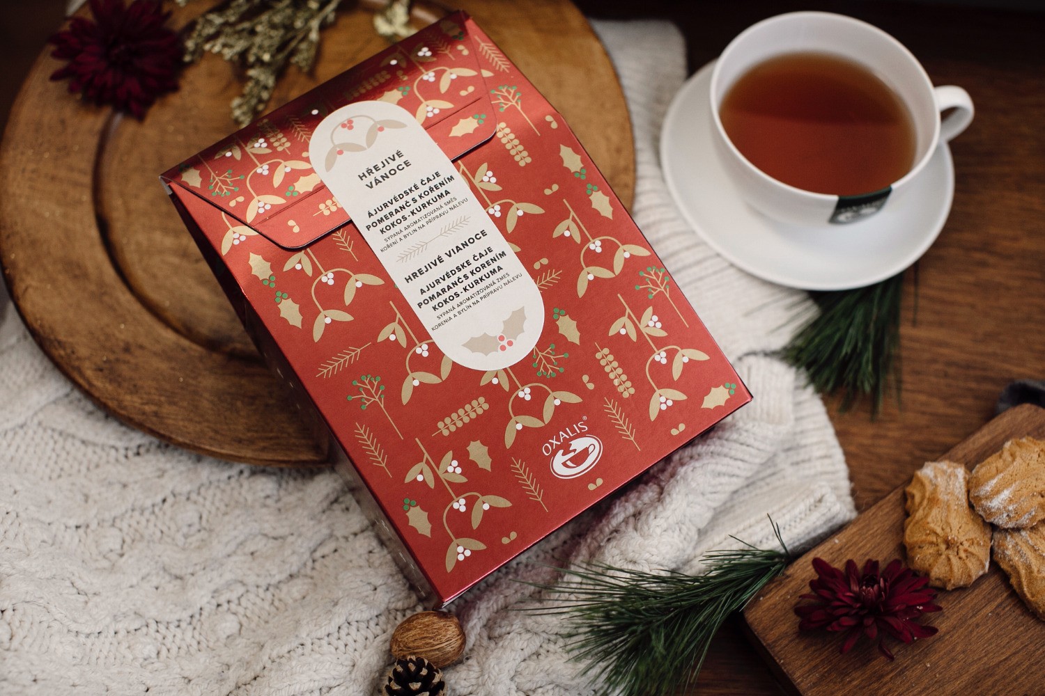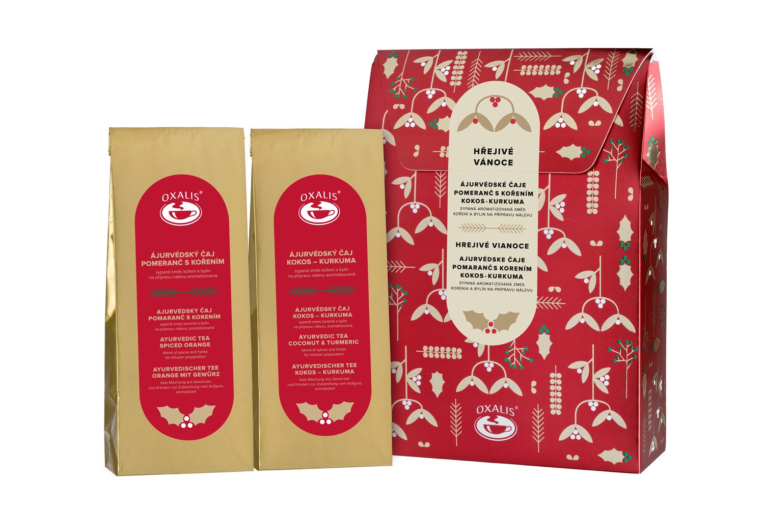 Tento dárek zahřeje nejen u srdíčka. Ve vánočně laděné taštičce najdete dva ájurvédské čaje Pomeranč s kořením a Kokos-kurkuma, které jsou směsí bylin a koření. Tyto čajové směsi nejen krásně voní a chutnají, ale díky obsahu koření dokážou krásně prohřát a mají příznivé účinky na zdraví.