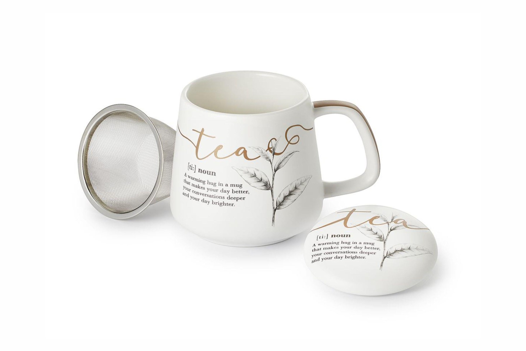 Stylový porcelánový šálek se zlatým nápisem „tea“ a jemným dekorem lístků. Součástí je víčko a nerezové sítko, díky kterým si pohodlně připravíš svůj oblíbený sypaný čaj. Objem - 400 ml.