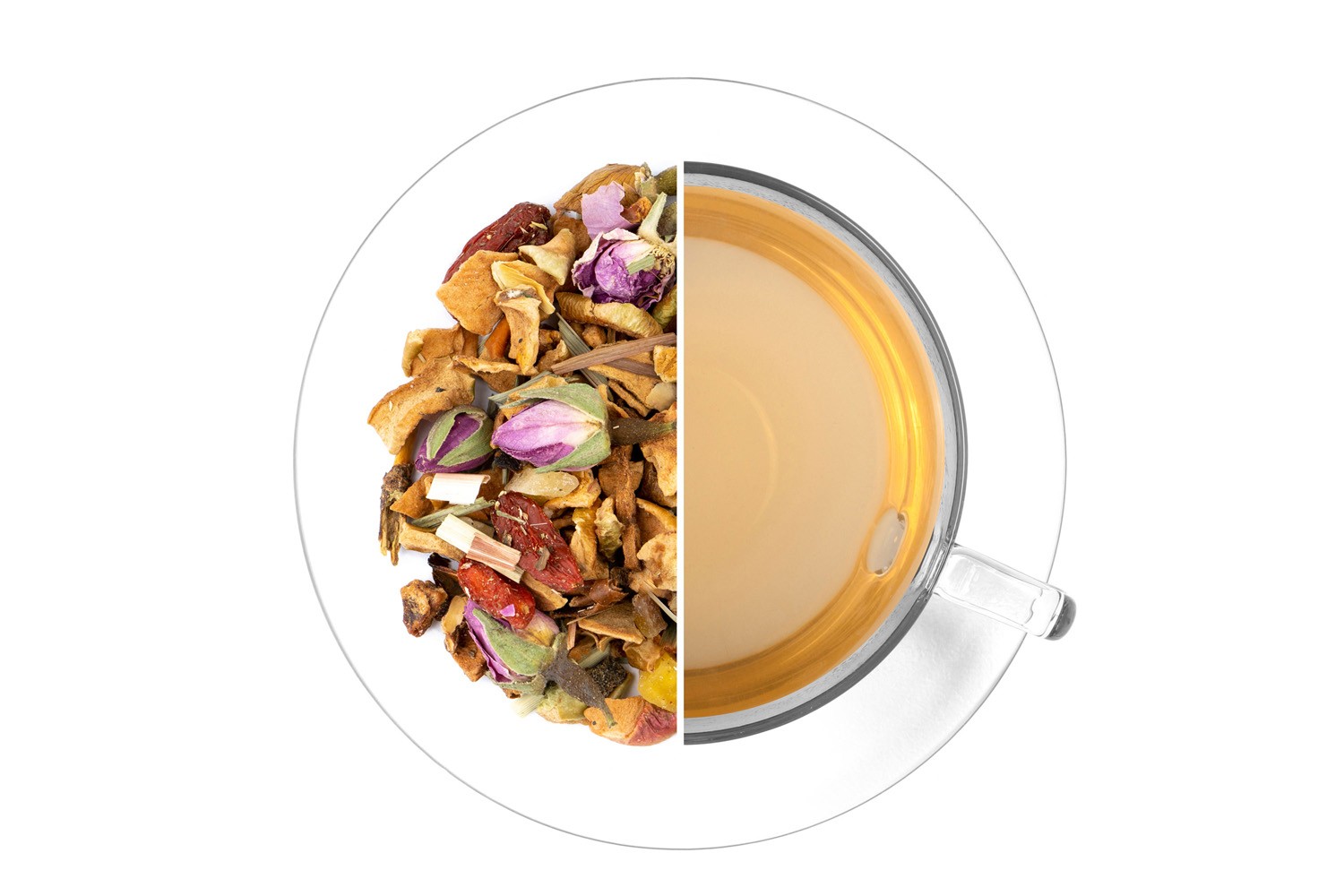 Jablka, ananas (ananas, cukr, regulátor kyselosti kyselina citronová), mango (mango, cukr, regulátor kyselosti kyselina citrónová) (9,4 %), plody goji, citrónová tráva (6,1 %), poupata růží, máta peprná nať, aroma. Může obsahovat stopy skořápkových plodů.