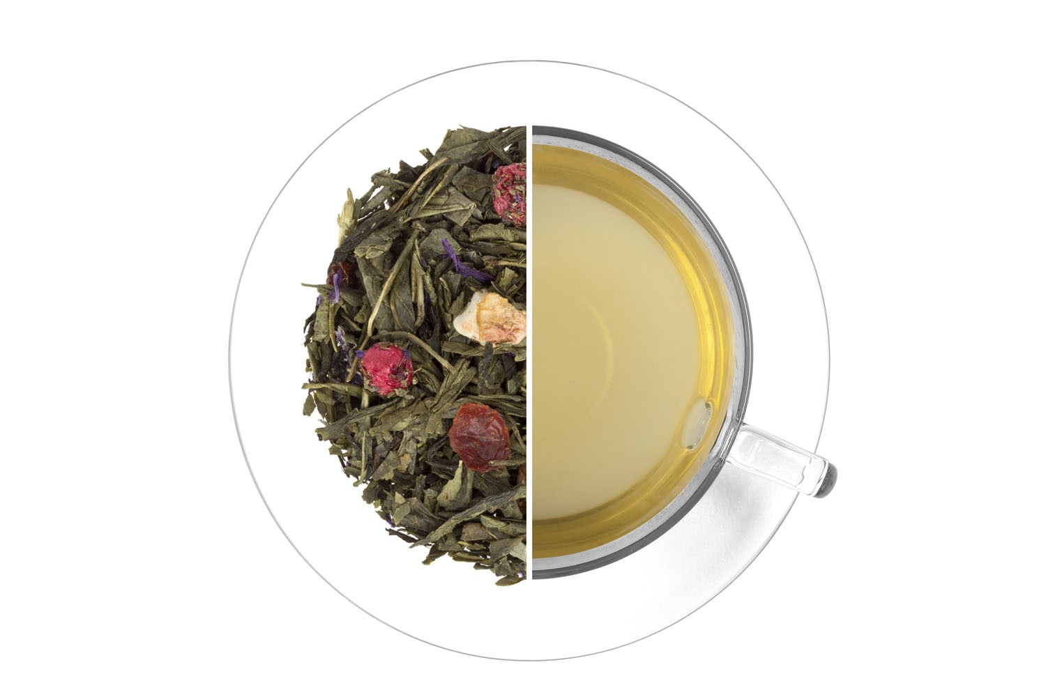 Pravý zelený čaj Sencha, aronie, klikva velkoplodá (kanadská brusinka) (klika, cukr, slunečnicový olej), šípky, aroma, ostružiny, borůvky, červený rybíz, sléz, jahody. Může obsahovat ořechy.