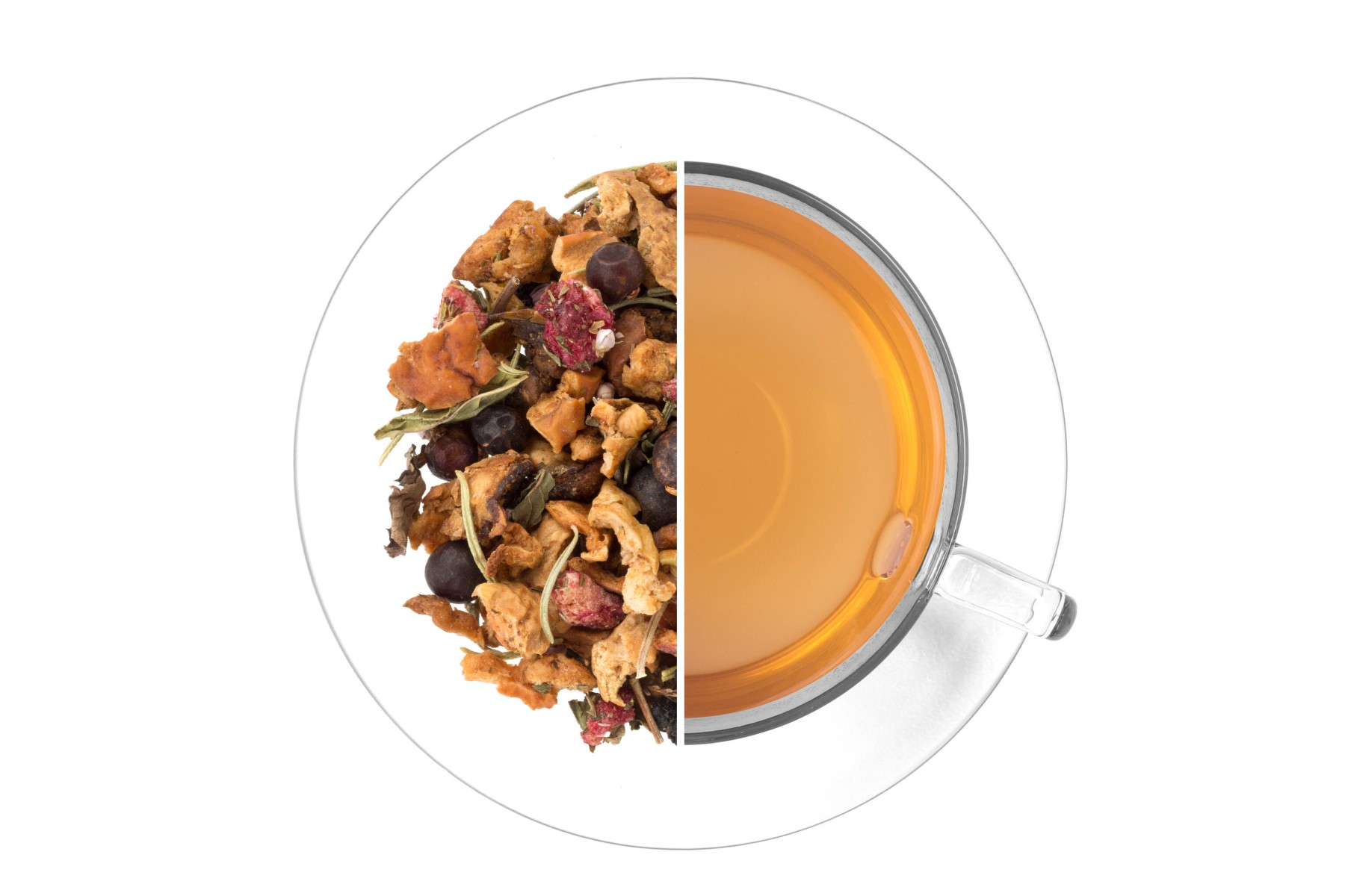 Jablko, černý bez plod, jalovec plod, rozmarýn list, nana máta list, vřes květ, granátové jablko plod, aroma, přírodní aroma. Může obsahovat stopy skořápkových plodů.