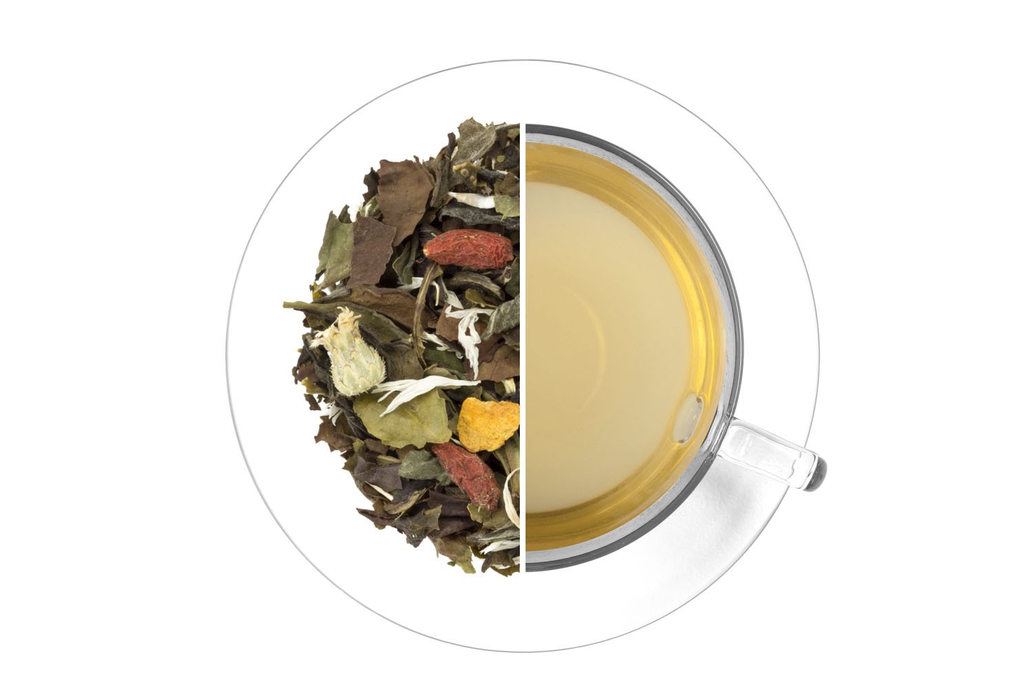 Pravé bílé čaje Shou Mei a Pai Mu Tan, plody goji, kůra granátového jablka, přírodní aroma, pravé bílé čaje White Pu-Erh Moonlight, Snow Buds, pravý zelený čaj White Monkey, nevadlec. Může obsahovat ořechy.