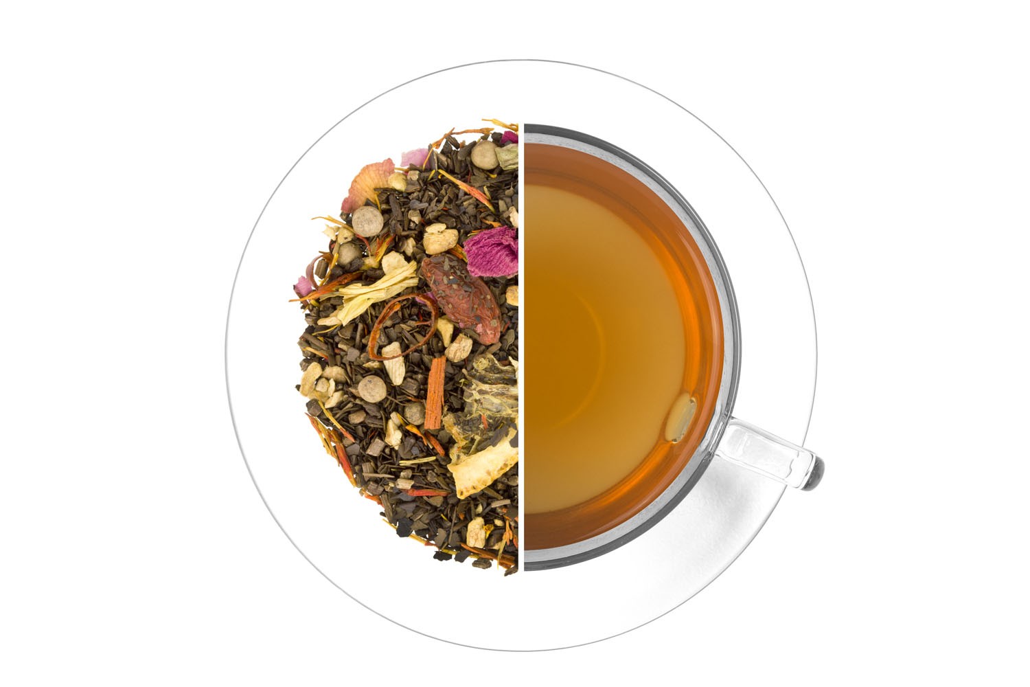Pražené mate (68,2 %), zázvor, aroma, plátky pomeranče, bílý pepř, plody goji (kustovnice čínská), červený pepř, pivoňka, santalové dřevo, chilli papričky, květy světlice barvířské, slunečnice. Může obsahovat stopy skořápkových plodů. Obsahuje kofein.