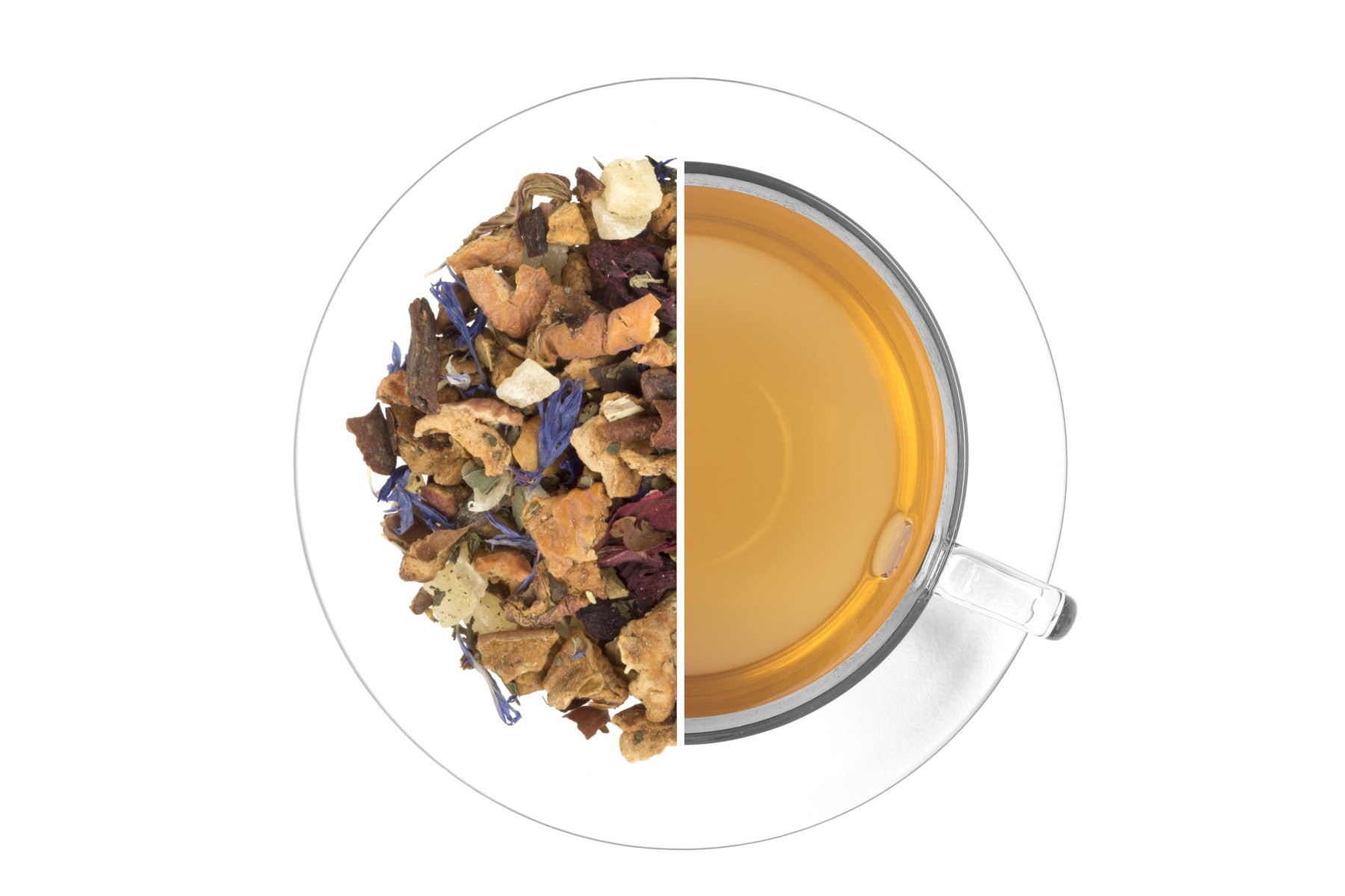 Jablka, ananas (ananas, cukr, regulátor kyselosti kyselina citrónová), kakaové slupky, ibišek, máta peprná nať (5,6 %), aroma, květy chrpy. Může obsahovat stopy skořápkových plodů.