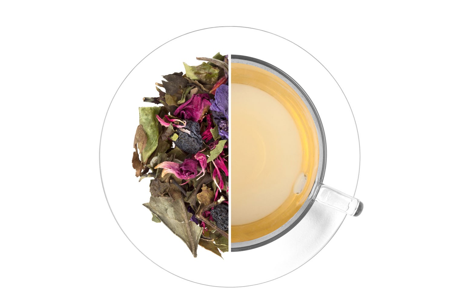 Pravé bílé čaje Shou Mei a Snow Buds (62,8 %), aronie plod, citronová kůra, květy růže, sléz, ibišek, květy chrpy, aroma. Může obsahovat stopy skořápkových plodů.