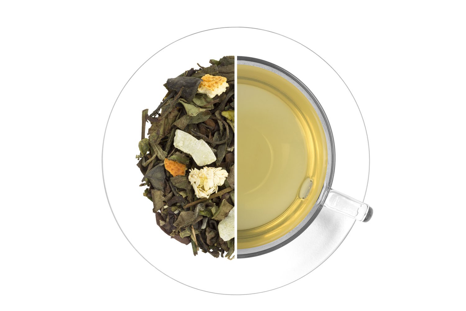 Pravé bílé čaje Shou Mei, Pai Mu Tan a Snow Buds, pravý zelený čaj China Bancha, kokos, pomerančová kůra, přírodní aroma, heřmánek římský, hřebíček, skořice. Může obsahovat stopy skořápkových plodů.