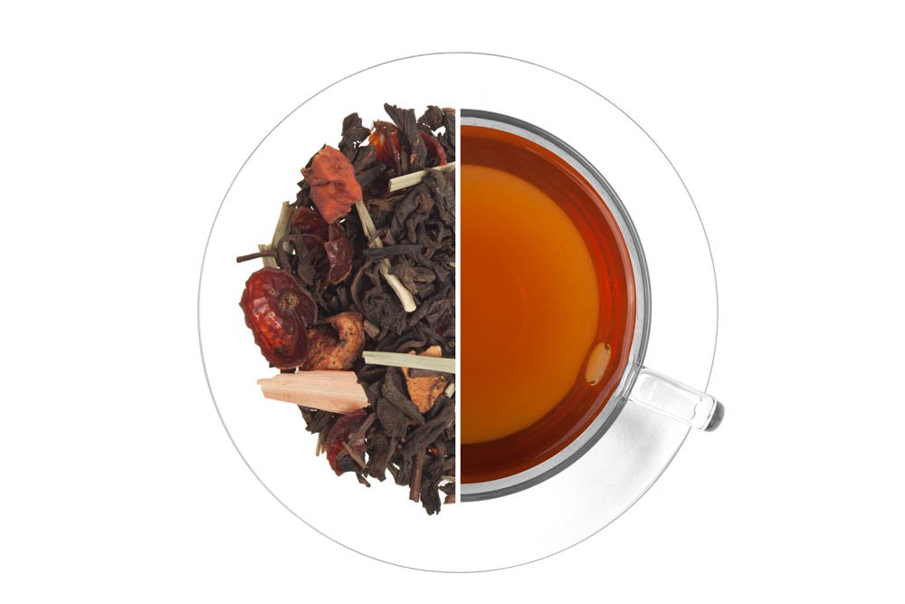 Čistý černý Pu-Erh čaj (85,2%), šípky, jablka, zelený maté, aroma, citronová tráva. Může obsahovat ořechy.