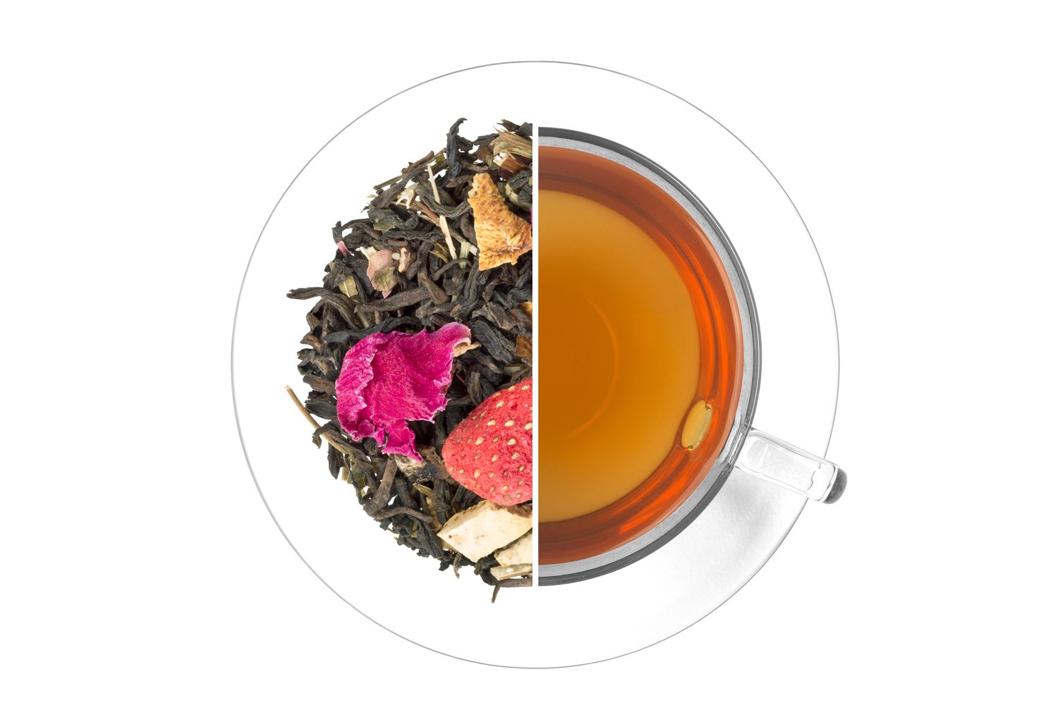 Pravý černý čaj Pu-Erh (71,1%), citrónová kůra, meduňka list, jahody, aroma, pivoňka květ. Může obsahovat stopy skořápkových plodů.
