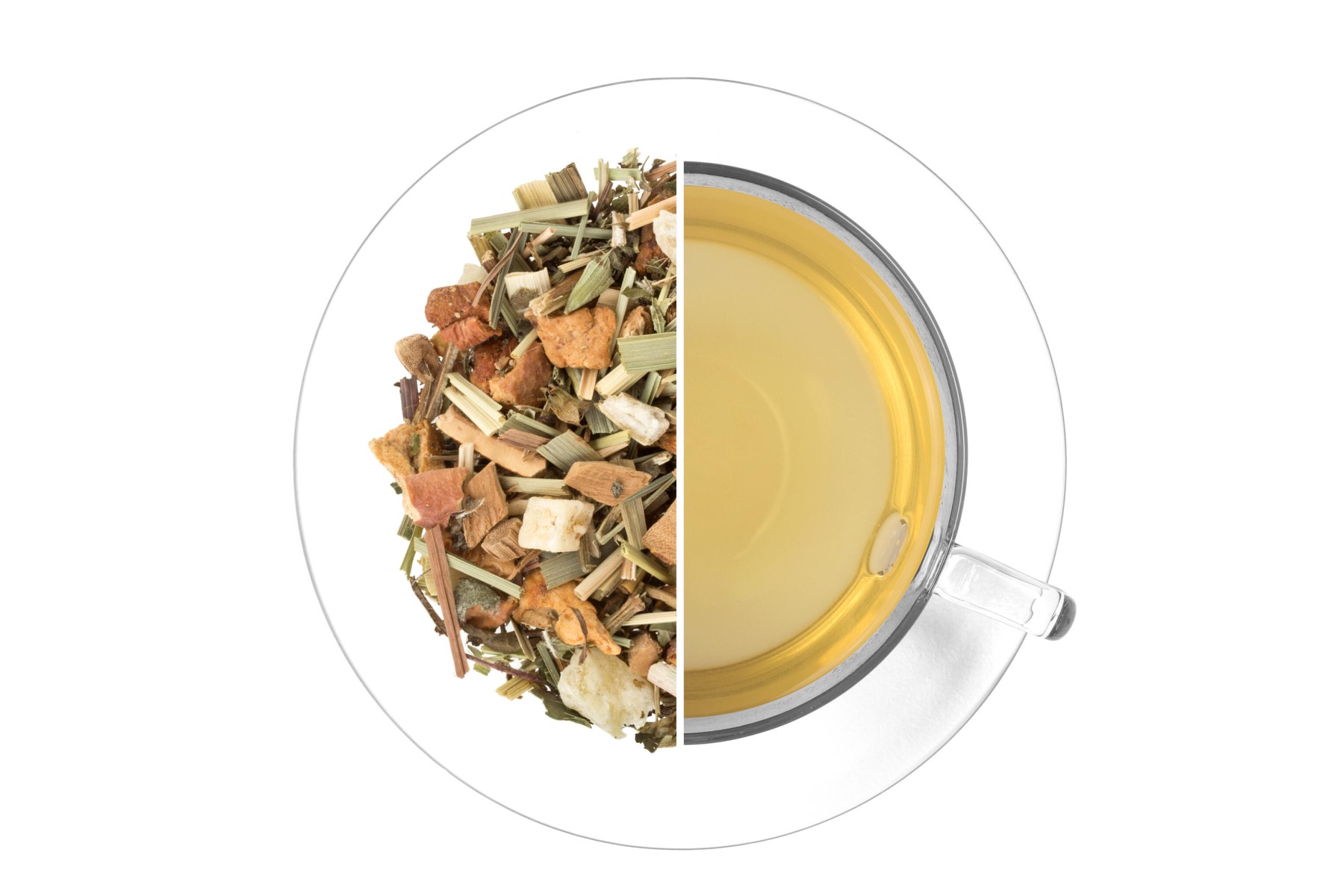 Jablko, meduňka nať, ananas (ananas, cukr, regulátor kyselosti kyselina citrónová), citronová tráva, sušená lesklokorka lesklá (reishi) 10%.