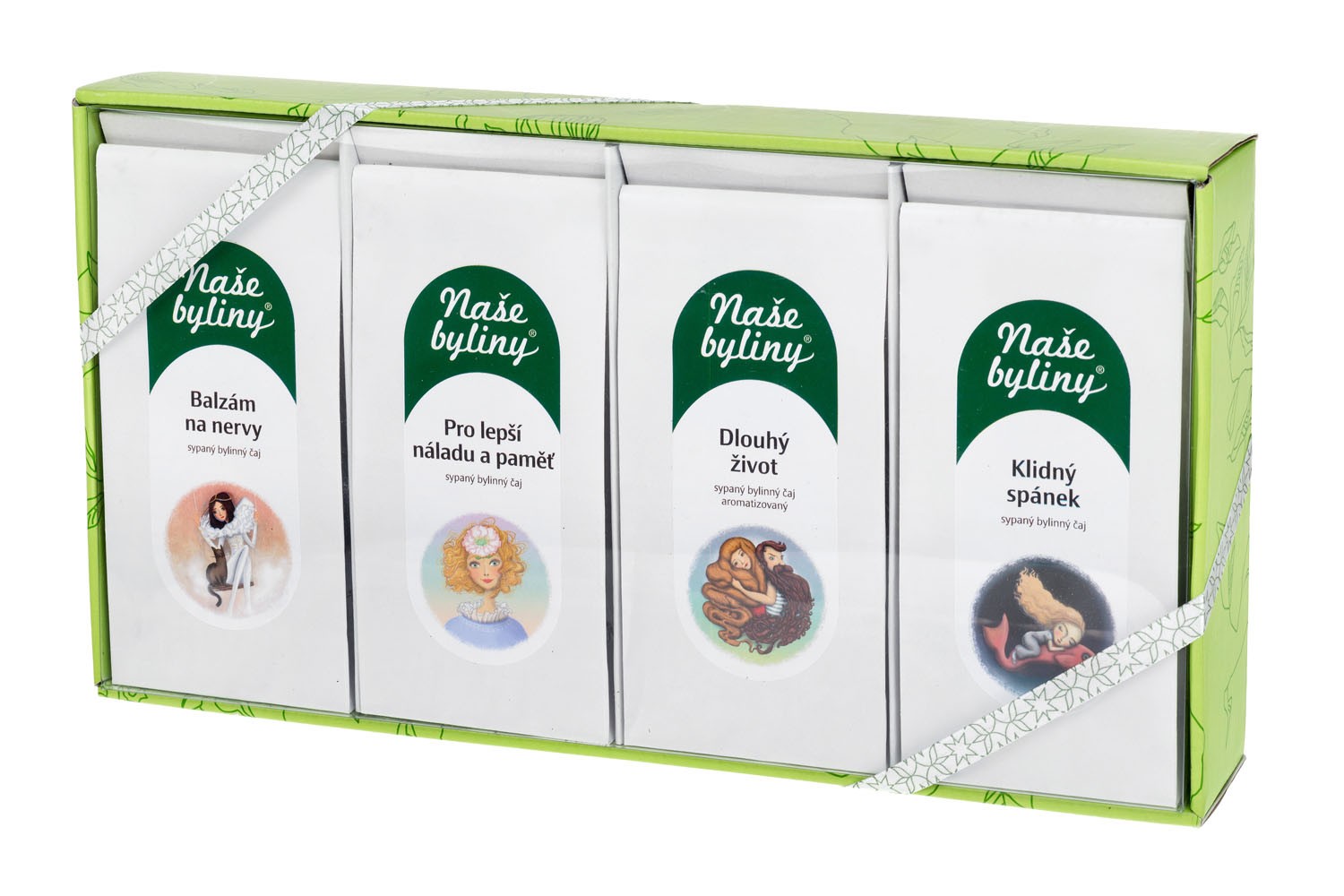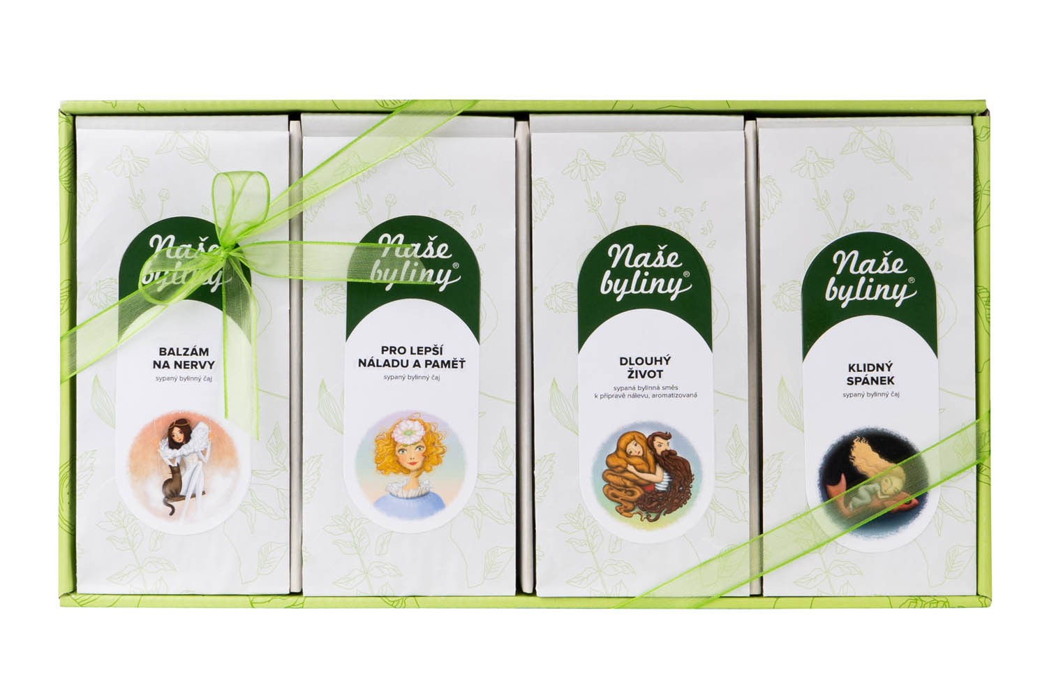 BALZÁM NA NERVY - Složení: listy meduňky, listy máty peprné, mučenka a květy levandule. DLOUHÝ ŽIVOT - Složení: zelený rooibos, třapatka nachová, květy heřmánku, zelený oves, listy máty, listy ostružiníku, tymián, květy levandule, verbena citrónová, květy měsíčku, chrpy polní a aroma. PRO LEPŠÍ NÁLADU A PAMĚŤ - Složení: meduňková nať, voňatková nať, dobromyslová nať, rozmarýnový list, ženšenový kořen, klanopraškový plod, levandulový květ a diviznový květ. KLIDNÝ SPÁNEK - Složení: rozinky (rozinky, slunečnicový olej), meduňková nať, fenyklový plod, heřmánkový, růžový, jasmínový květ, voňatková a šalvějová nať.