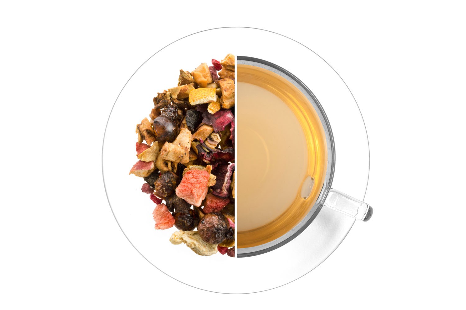 Jablka, ibišek, pomerančová kůra, maliny, aroma, jahody, červený rybíz. Může obsahovat stopy skořápkových plodů.