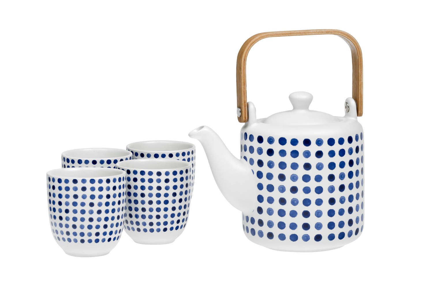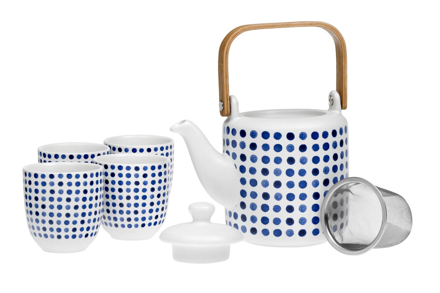 Keramická konvice s nerezovým sítkem a pokličkou se čtyřmi šálky je praktická sada pro čajové chvíle. Bílý dekor s modrými puntíky působí hravě a elegantně. Konvice má objem 0,7 l, šálky 0,17 l.