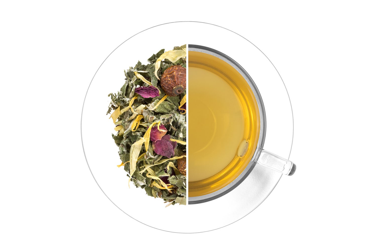 Maliník list, kopřiva list, smetánka kořen, šípek, bříza bělokorá list, Paulinie nápojná plod (Guarana), černý bez květ, květy růže a měsíčku.