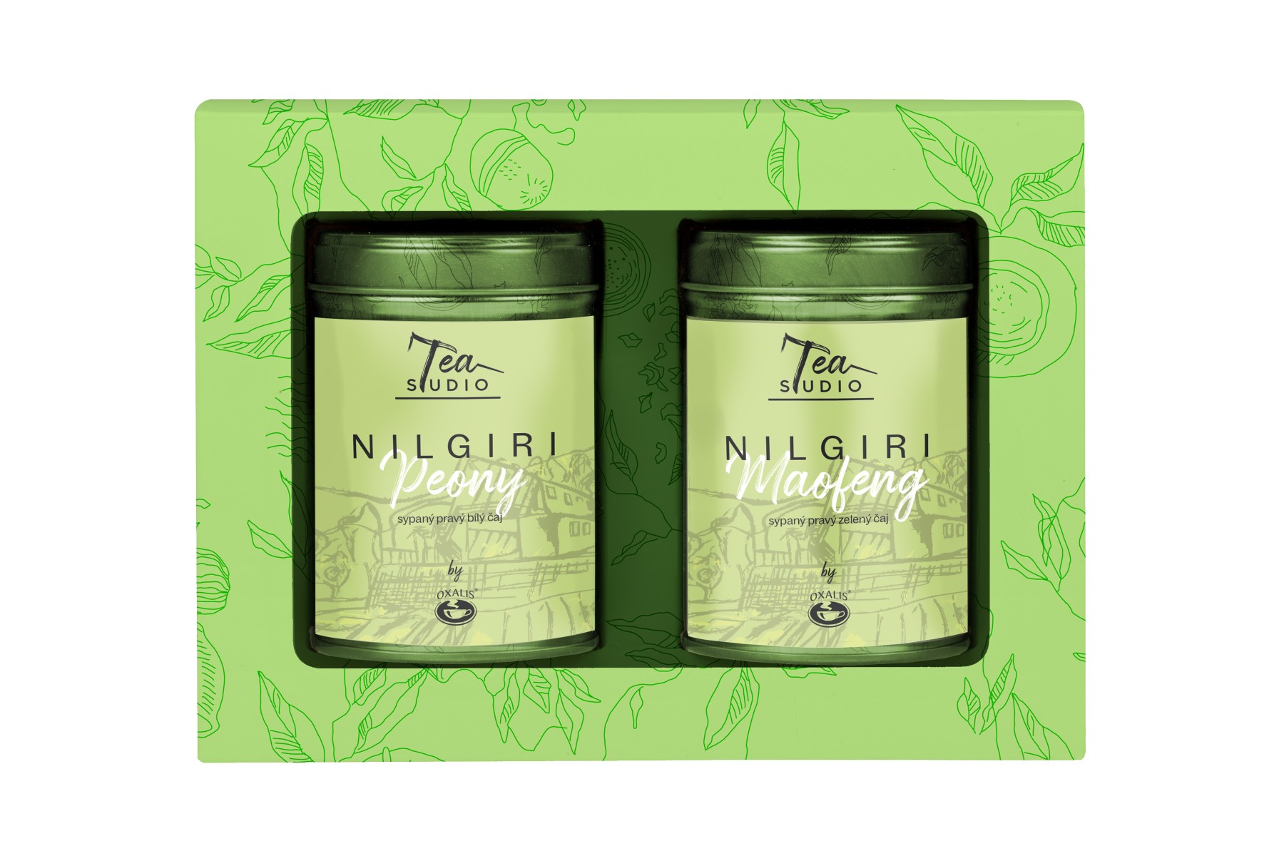 Oxalis Tea Studio - Nilgiri Peony 15 g - sypaný pravý bílý čaj Oxalis Tea Studio - Nilgiri Maofeng 30 g - sypaný pravý zelený čaj, plechové dózy, kartonový obal.
