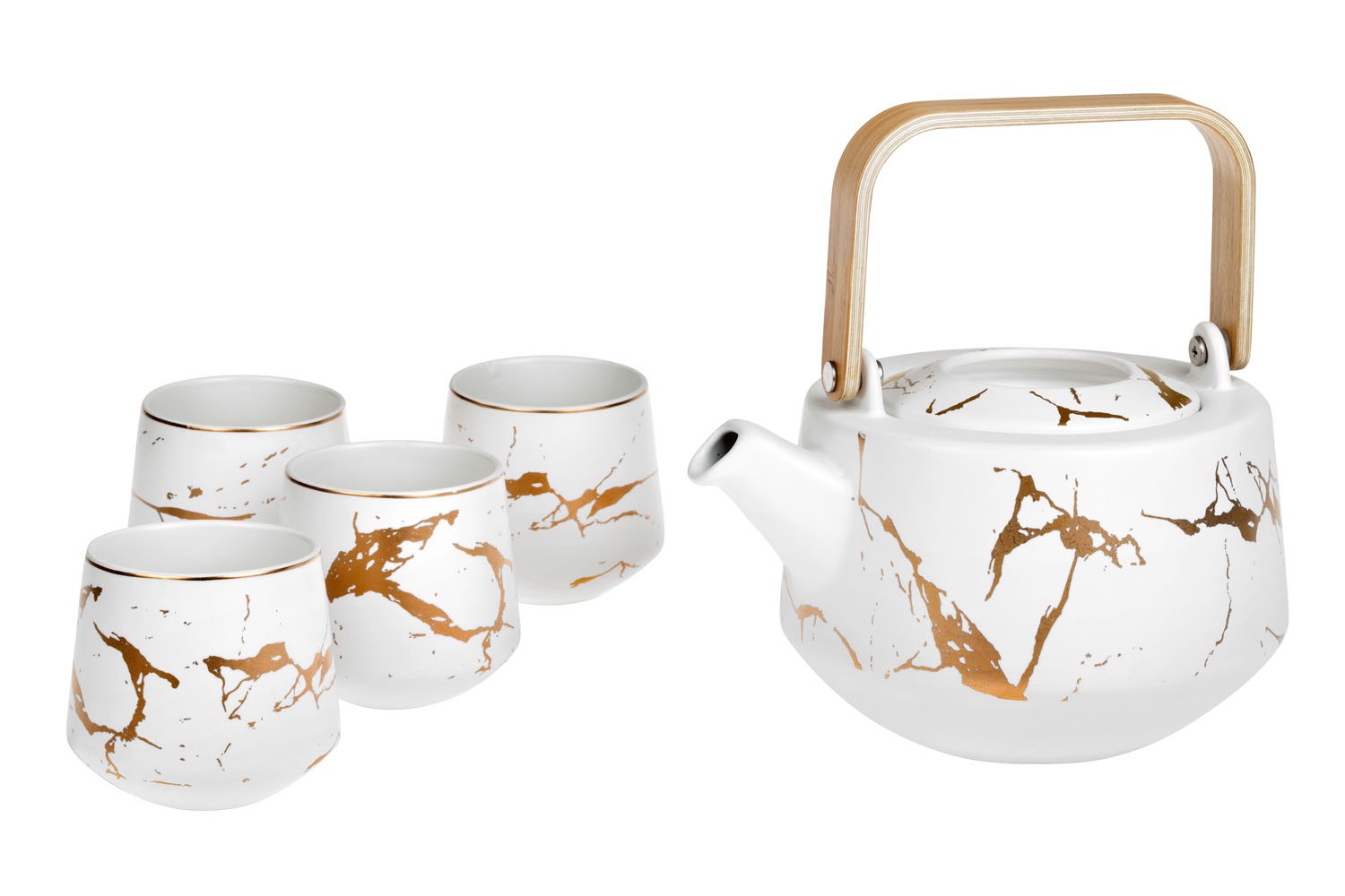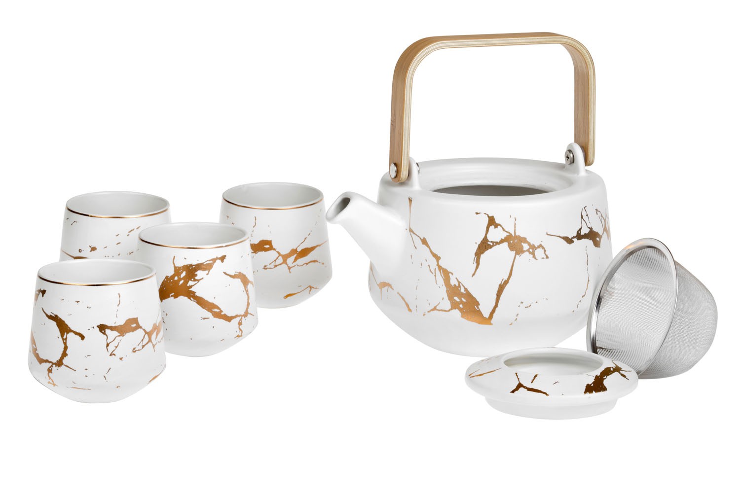 Sada na čaj obsahující čajovou konvici o objemu 0,8 l, nerezový sítko a 4 čajové šálky o objemu 0,175 l každý. Není vhodné do myčky nádobí.