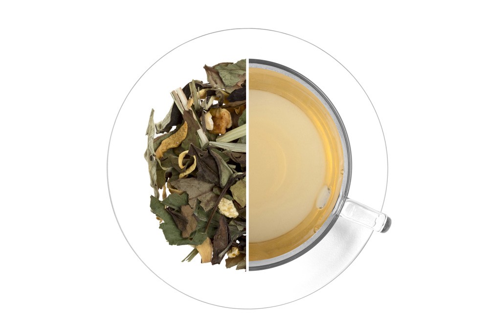 Pravý bílý čaj Shou Mei, jablka, citrónová tráva, pomerančová kůra, květy pomerančovníku, aroma. Může obsahovat stopy skořápkových plodů.