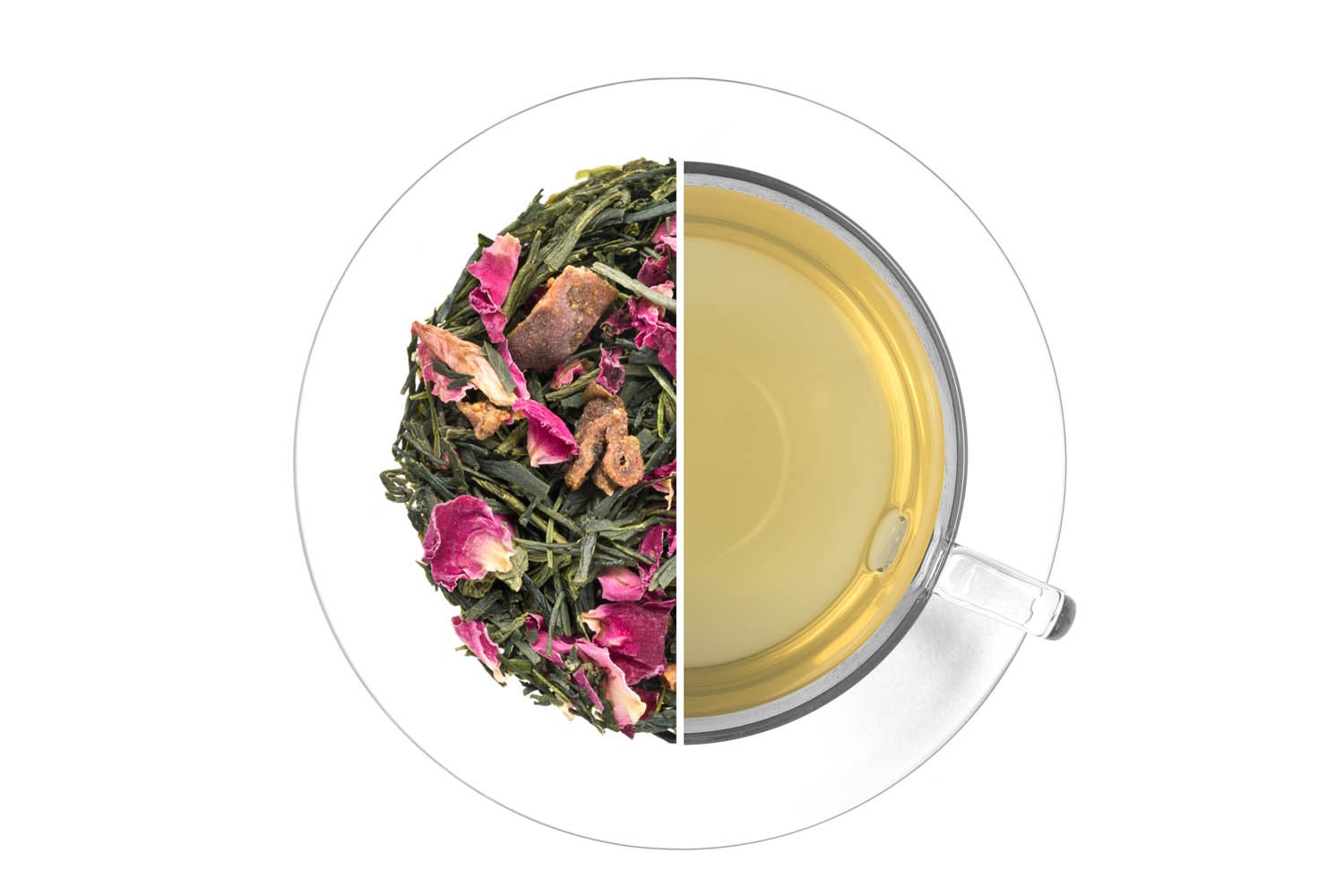 Japonský zelený čaj Sencha (79,5 %) hrušky, květy růže a přírodní aroma. Může obsahovat stopy skořápkových plodů.