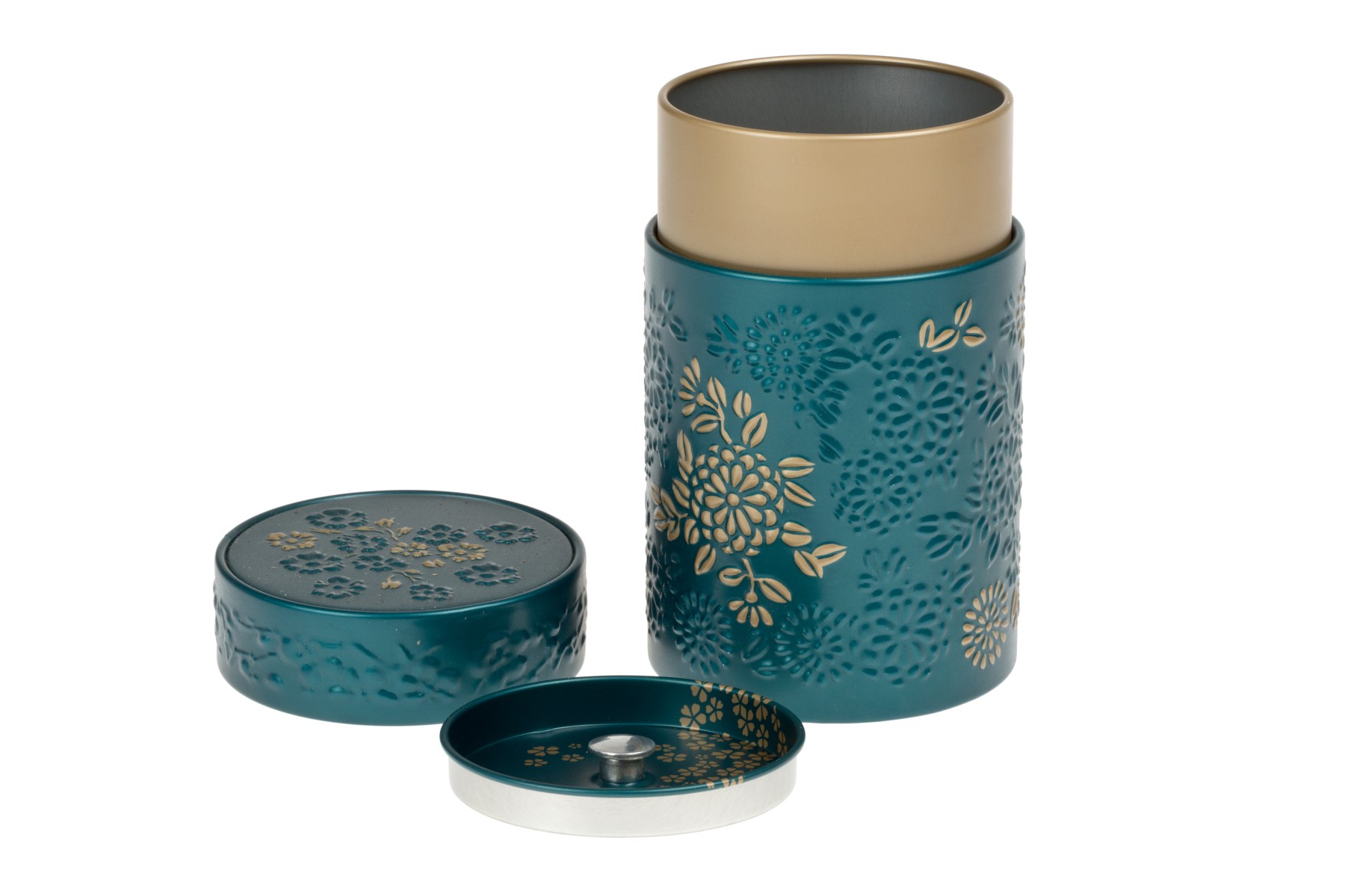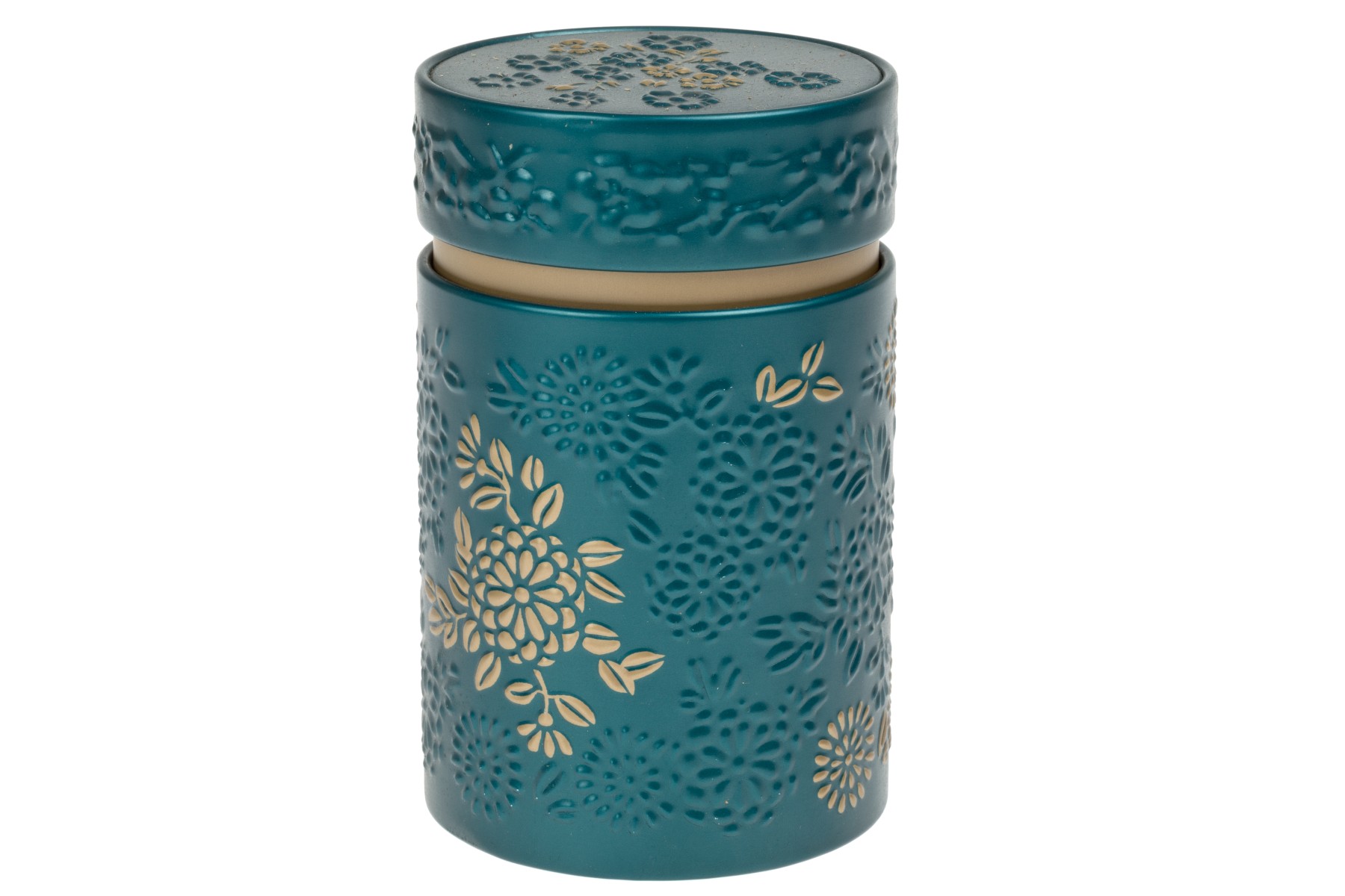 Stylová plechovka v odstínu petrol s jemným květinovým reliéfem. Vnitřní víčko zajistí lepší uchování čerstvosti čaje či kávy. Praktická a zároveň dekorativní, ideální na uskladnění až 150 g čaje. Rozměry: 75 × 117 mm.
