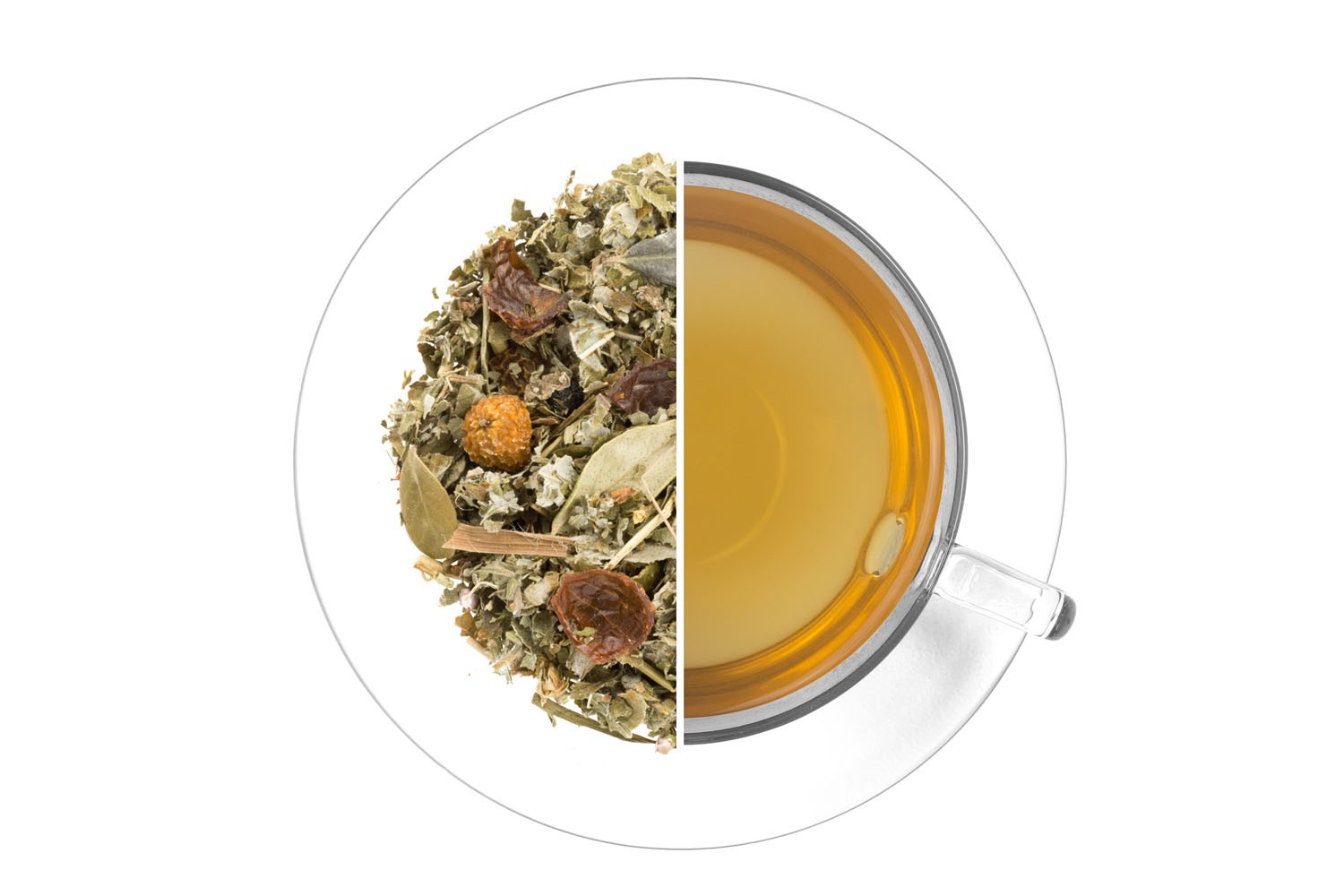 Maliník list, černý bez plod, ostružiník list, jahodník list, šípek, listy brusinky, vřes květ, aroma. Může obsahovat stopy skořápkových plodů.