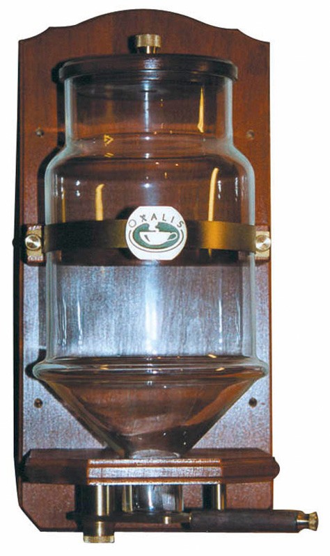 Závěsný skleněný zásobník na 1,5kg kávy - ruční sklářská práce. Rozměry: výška 43,5 cm, šířka 21 cm, hloubka 22 cm. K dodání do 3 týdnů.