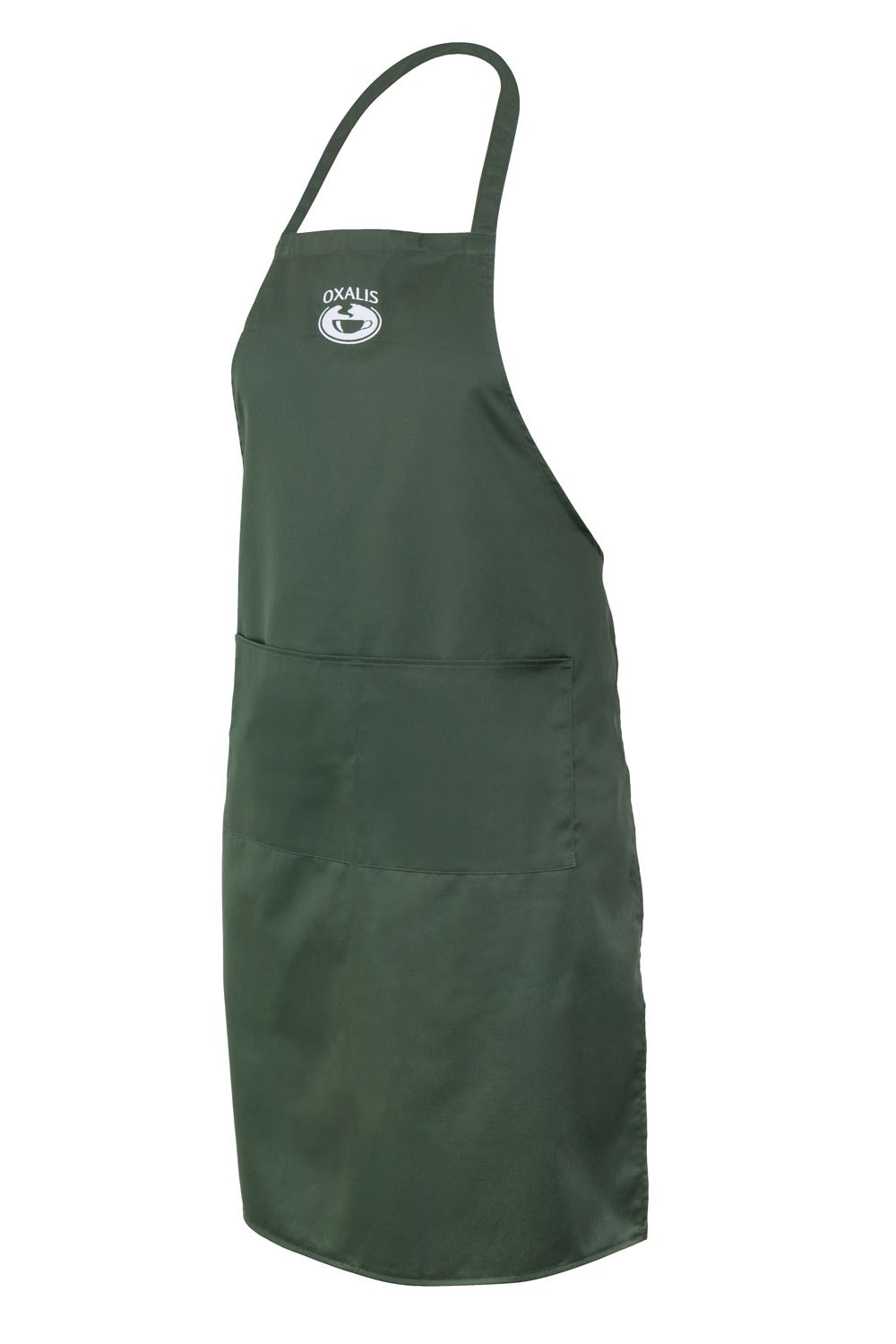 Krásná tmavě zelená zástěra s vyšitým logem OXALIS. Univerzální velikost - 65 % polyester, 35 % bavlna.